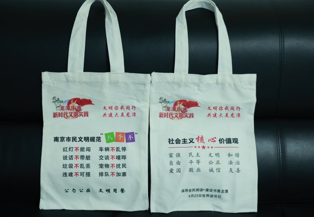 据了解,实践所此次印制了一批宣传环保袋,上面印有社会主义核心价值观、南京市民文明规范“八个不”、倡导全民阅读、使用公勺公筷等精神文明宣传内容,进一步宣传文明城市建设,形成人人知晓、人人参与、人人共享的良好社会氛围。