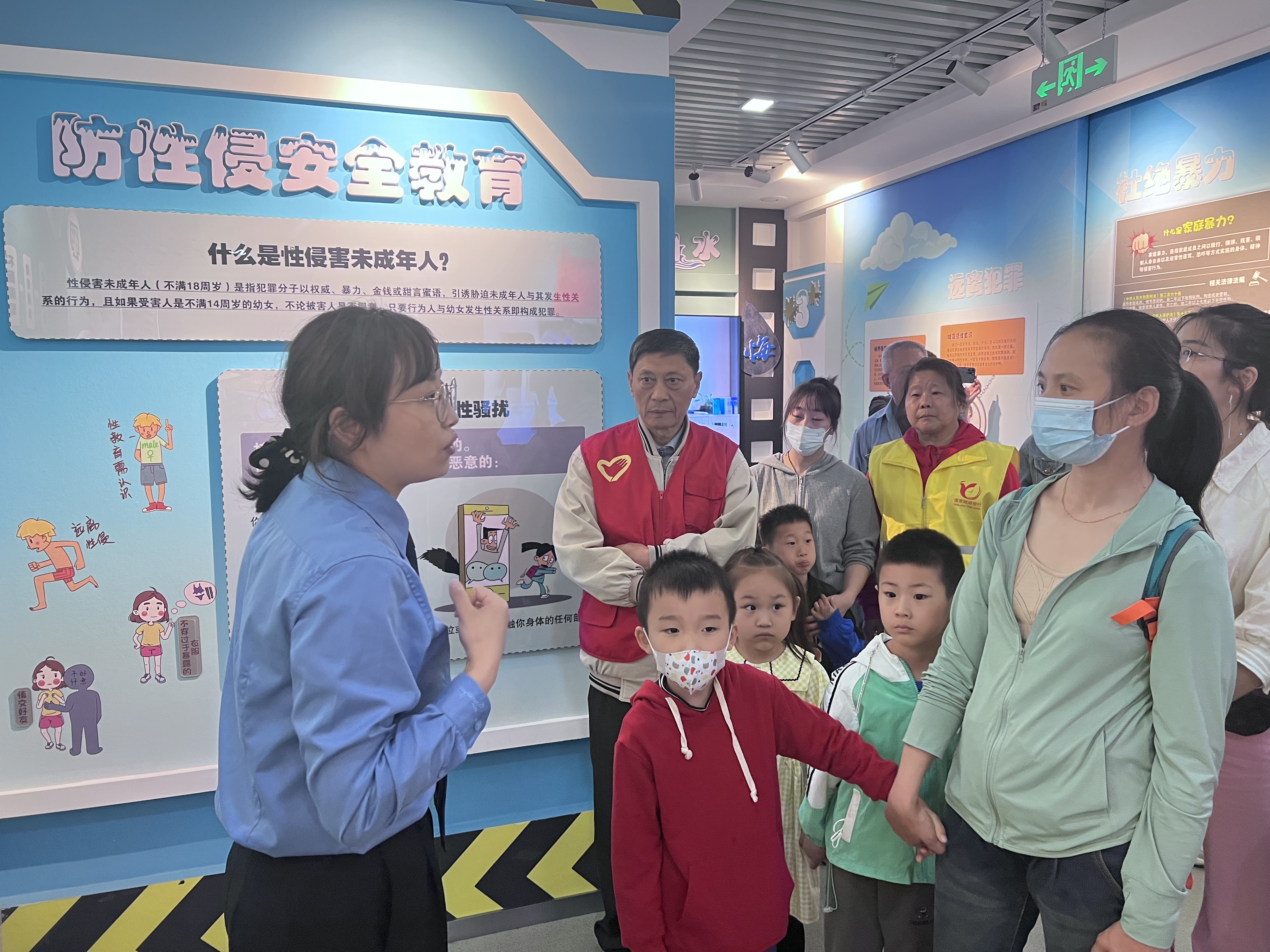 参观过程中,检察官带领小朋友们和退役军人老党员打卡未保中心的模拟法庭、训诫室,介绍模拟法庭、训诫室的布局和功能,让小朋友们了解和感受司法的威严。在法治教育展馆,检察官结合四大主展厅的内容,向大家介绍了相关未成年人保护的法律,并告知孩子们哪些是不良行为、严重不良行为和犯罪行为,以及如何加强自我保护等。退役军人老党员童师傅说:“以前只在电视上看过审案子,今天的观摩活动很直观、很生动,是一堂很好的法制教育课,这样的活动以后有机会我还想参加。”