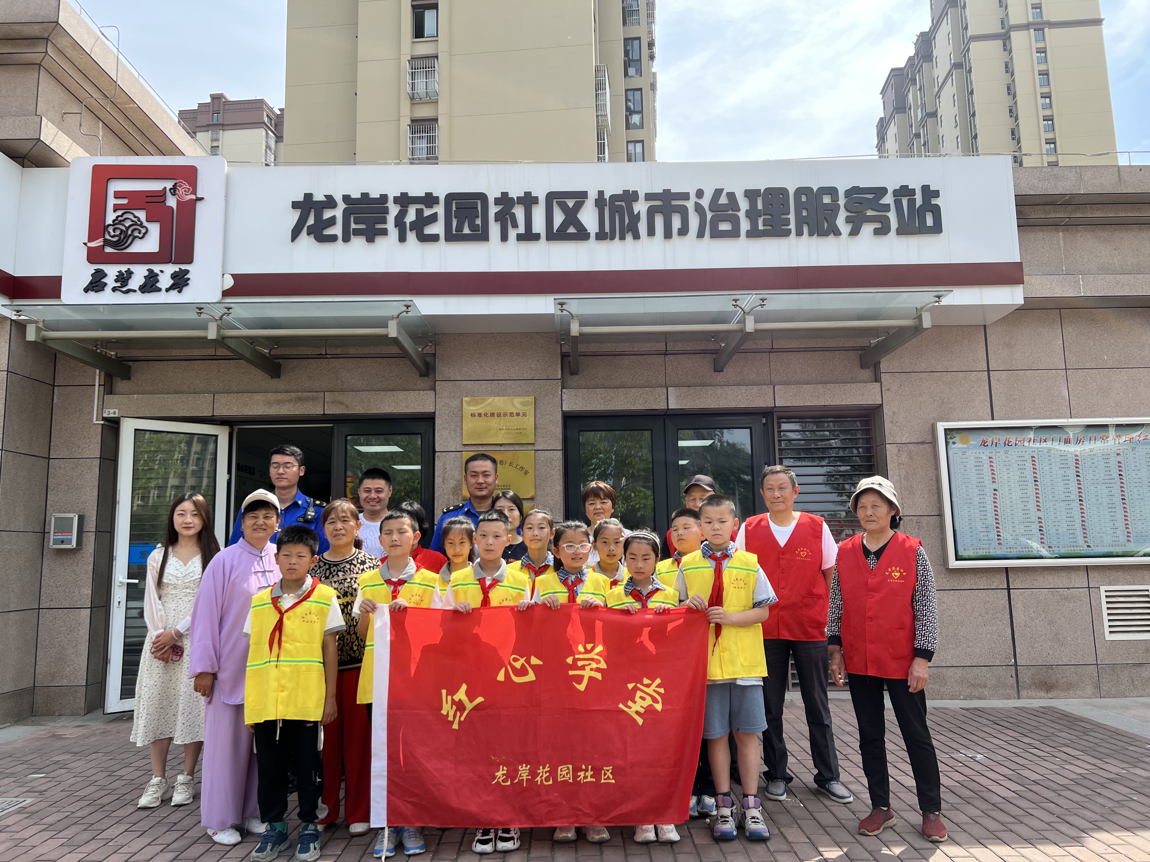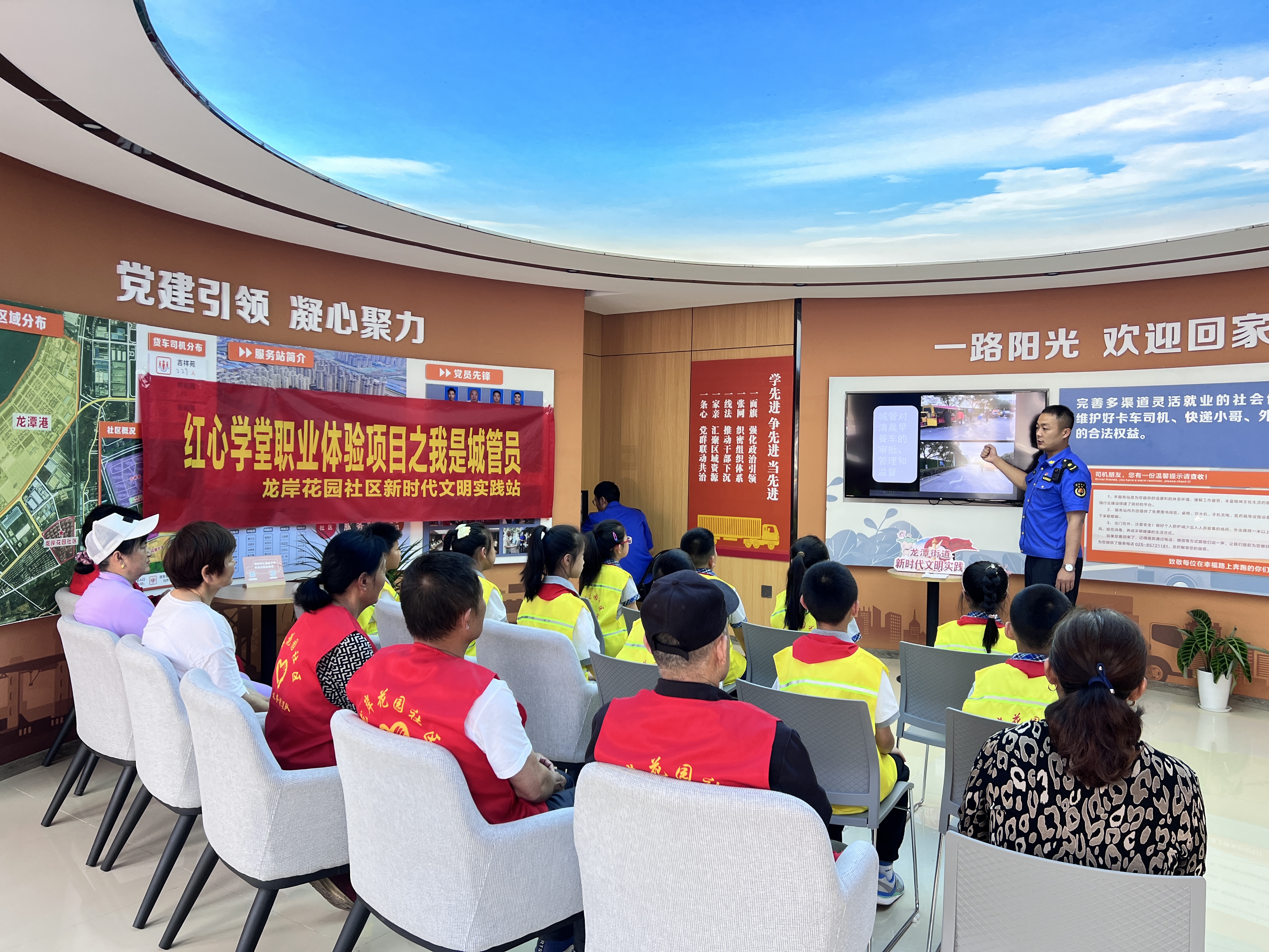 为进一步推动红心学堂职业体验项目落地落实,帮助社区居民及青少年了解城市管理职责,树立城市主人翁意识,5月16日,龙岸花园社区教育学校联合综合执法大队、龙潭中心小学开展了“红心学堂职业体验项目之我是城管员”活动。