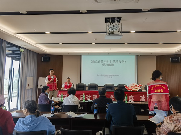 活动开始,由社区工作人员给辖区居民们普及《南京市住宅物业管理条例》条文内容,并就居民关心的热难点问题进行解答,引导居民们正确行使业主权利,履行好条例规定的义务,让小区居住氛围更加文明和谐。