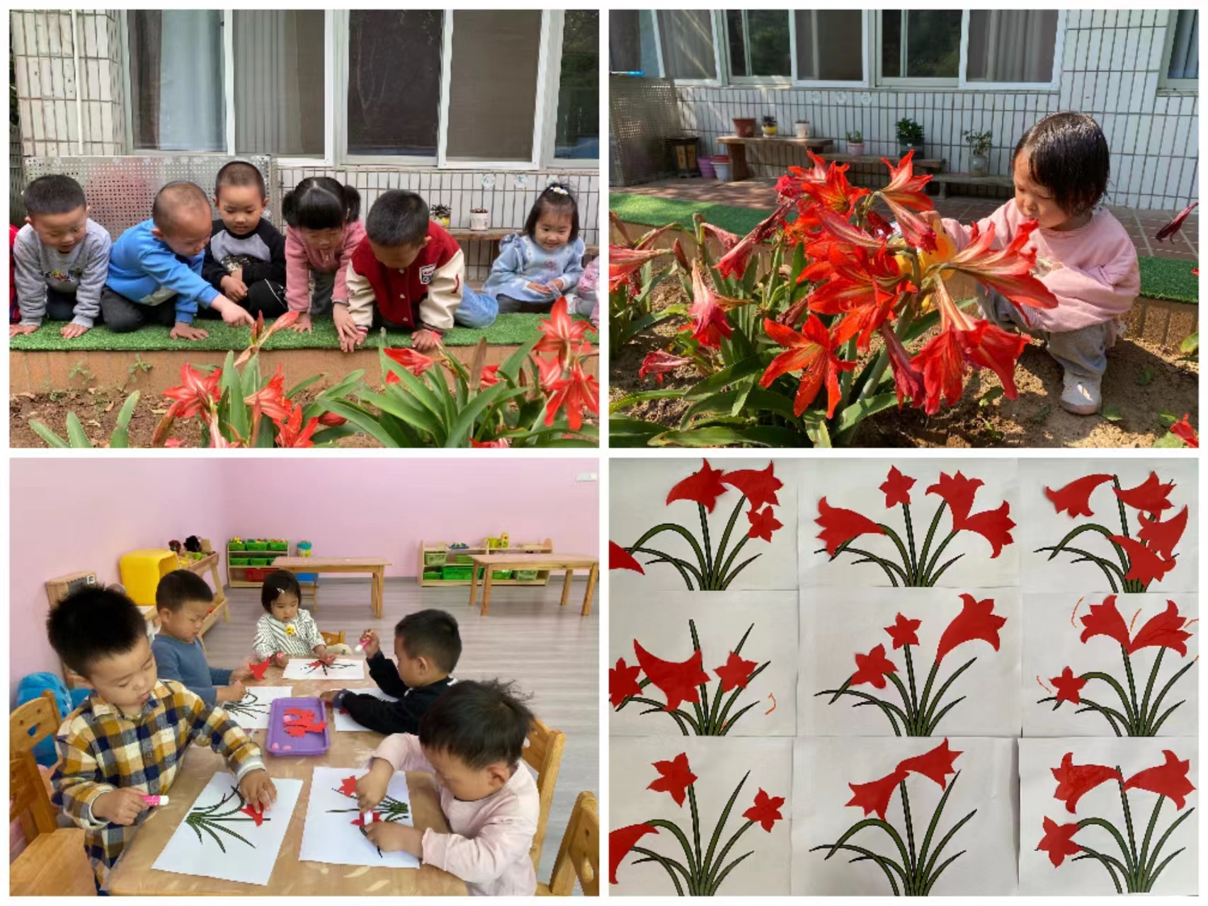 朱顶红,又叫百枝莲、孤挺花、华胄兰、对红等,是石蒜科多年生草本植物。朱顶红有很多不同的品种,叶厚有光泽,花色繁多,柔和艳丽,花朵硕大肥厚。社区园外的花坛里,长出了许多朱顶红,志愿者带孩子们认识美丽的朱顶红,并给花儿仔细浇水降温,促使它更好的开花成长。开了花的朱顶红在阳光的照耀和绿叶的衬托下十分艳丽,孩子们开心地说道:“朱顶红花的形状像小喇叭、像小星星、五角星的”。于是,孩子们用画笔和彩纸记录下那一张张红似火的舞裙,并互相愉悦地展示作品。
