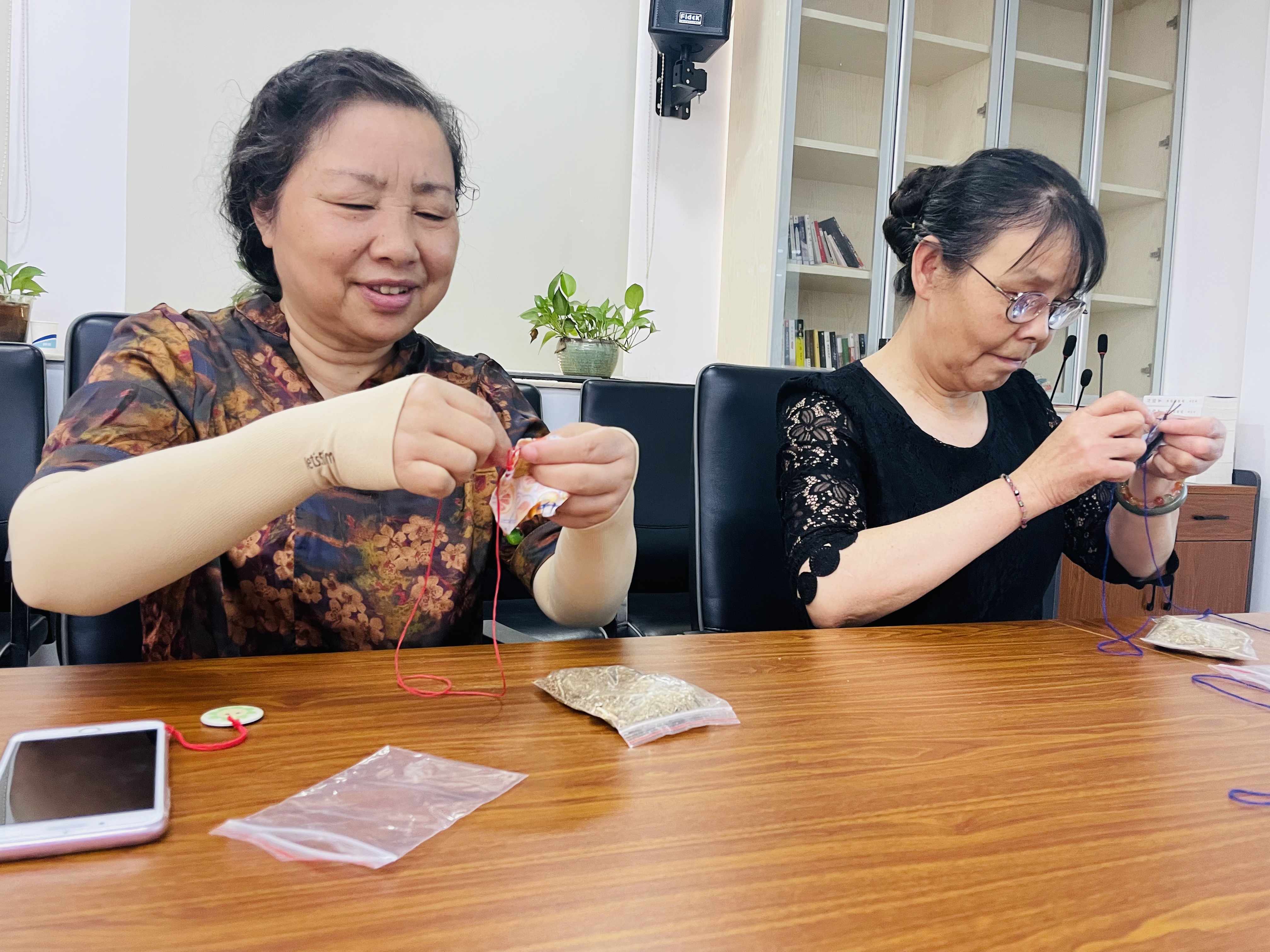 作为入选世界非物质文化遗产的传统节日,端午已不仅是一个节日、一个文化符号,更是一条凝结着民族精神与情感、承载着文化血脉和思想精华的纽带。在这样的文化背景下,中医老师现场跟大家分享了端午知识及其与中医的渊源,之后给学员带来了香囊手工制作。在制作过程中,老师先将防蚊虫香囊配方说与大家,并将配方选材一一介绍并展示,接着通过穿针、引线、打结、裁剪、装香料、缝合等香囊制作步骤进行讲解,一步步教授、指导大家制作香囊。大家听得专注、学得认真,纷纷穿针引线,一边动手一边交流,气氛十分热烈;不一会儿,一个个形状各异的香囊就慢慢缝制成型了。看着自己亲手制作的香囊,每个人的脸上都洋溢着笑容。