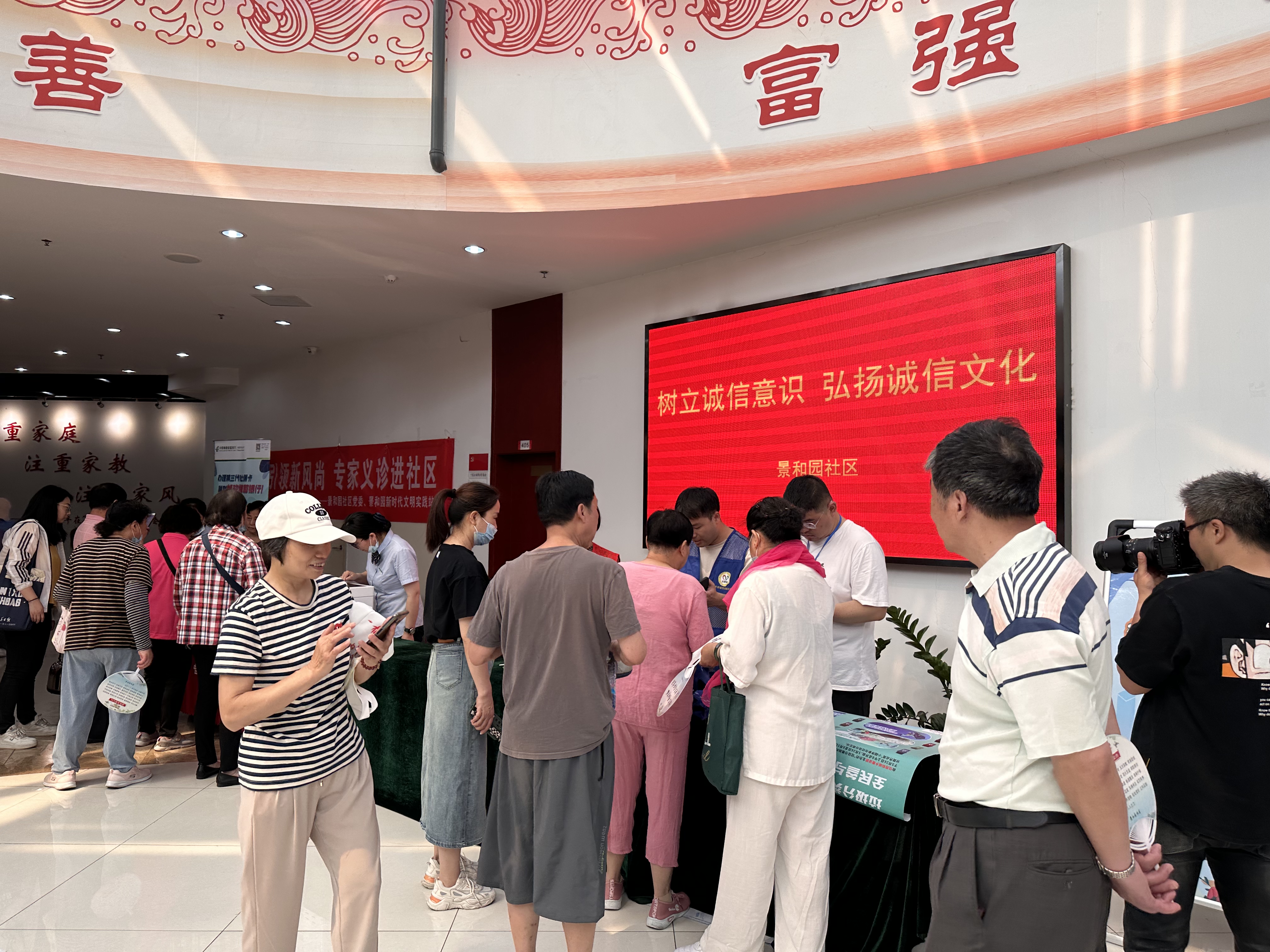 通过掌上云社区的宣传,一大早景和园社区便民服务中心就排满了前来参加活动的居民。居民一边排队等候专家问诊,志愿者一边向居民发放“推进诚信建设”倡议书,并从增强诚信意识、树立诚信理念、宣扬诚信精神、坚持诚信经营等方面,向居民进行诚信宣传教育,号召全体辖区居民加强个人诚信文化建设,共同努力守护诚信品德,遵守国家法律法规。