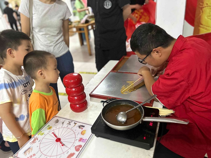 现场还有画糖人、捏面人和编织鸭蛋兜等活动。围观的小朋友有的拿着糖人美美地享受,有的满怀期待地等着师傅手里的糖人。