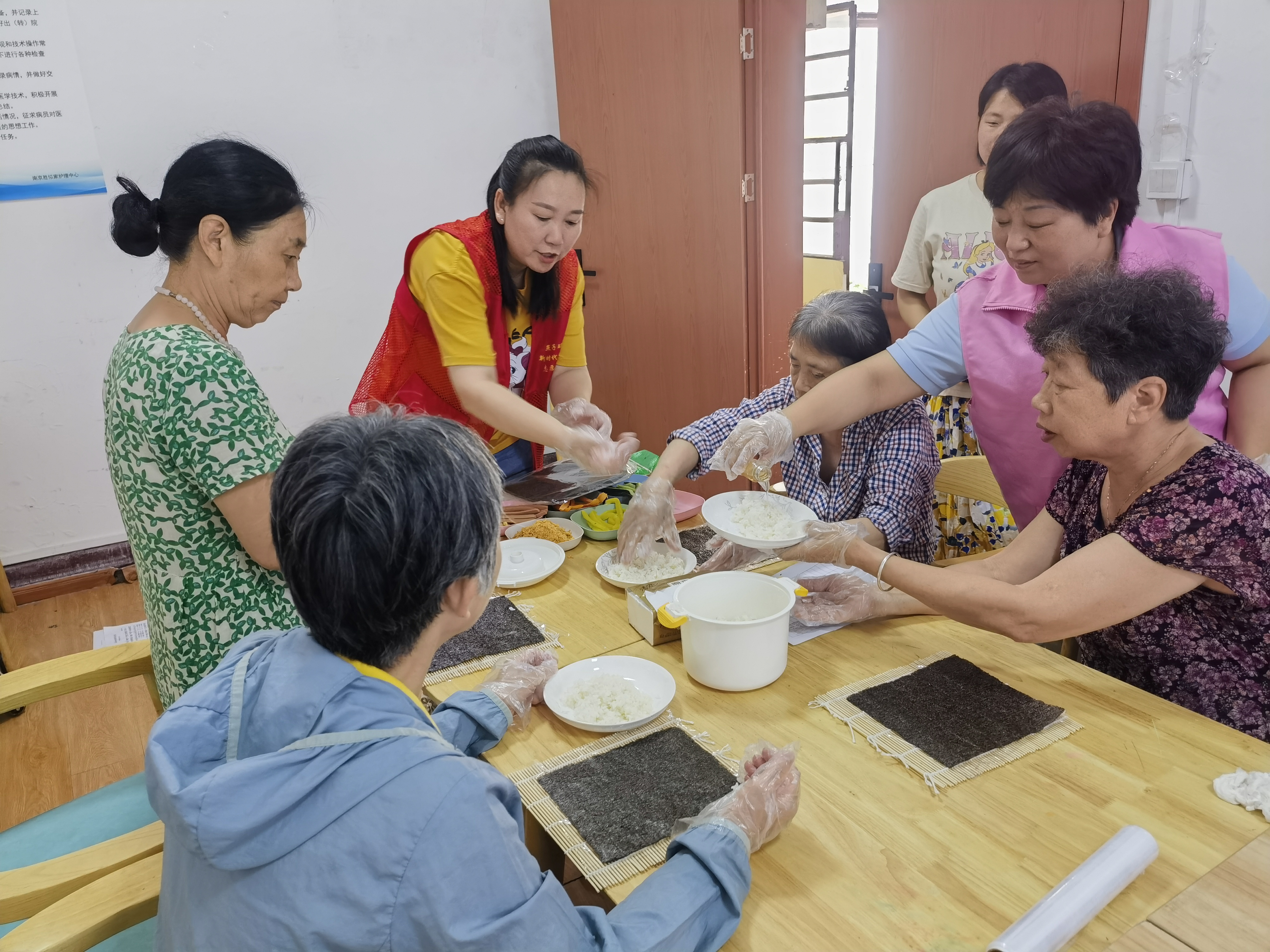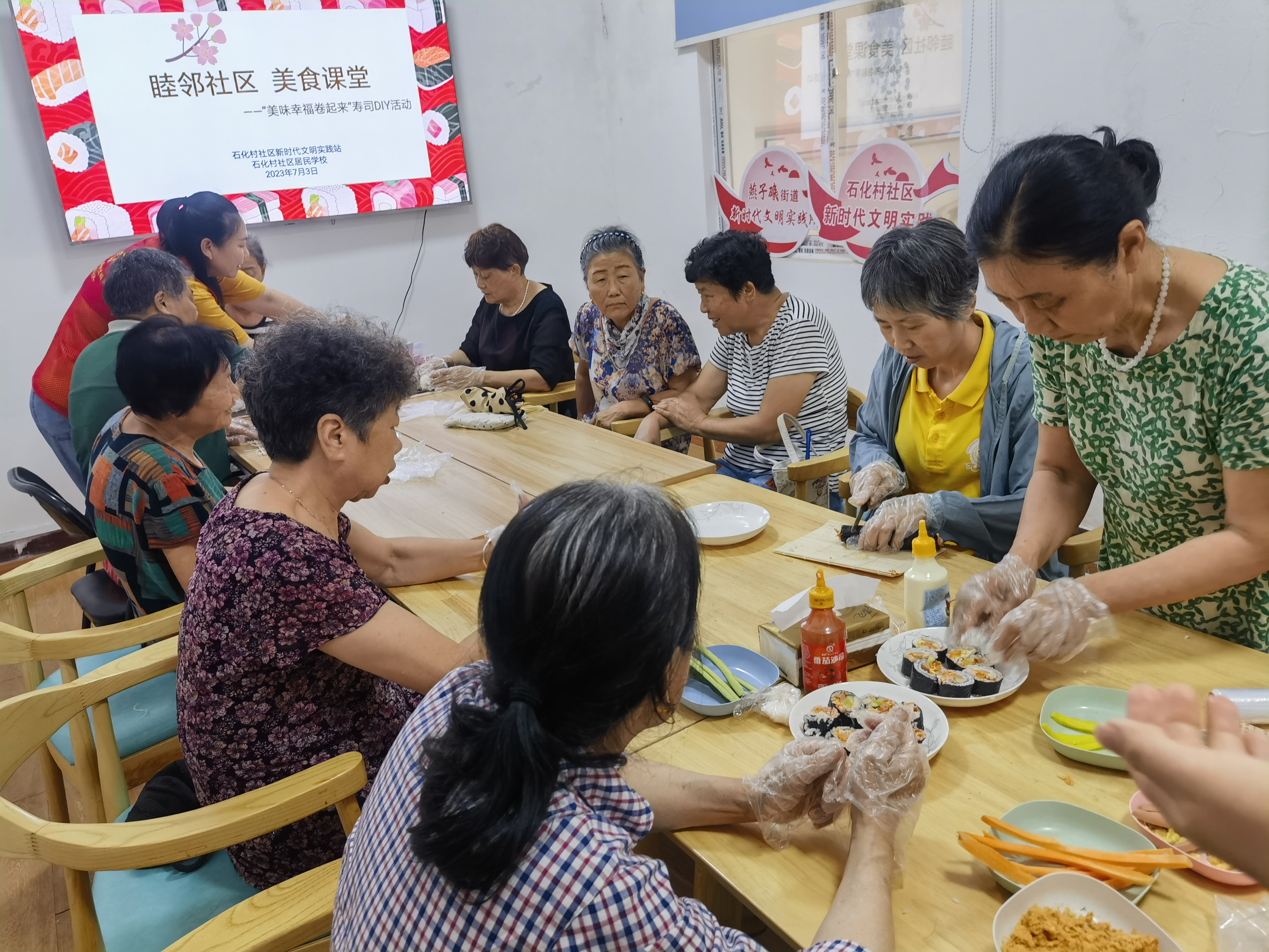 为深入贯彻党的二十大精神,铸牢中华民族共同体意识,丰富辖区居民闲暇生活,增进邻里和谐友好关系,7月3日下午,石化村社区居民学校开展了睦邻社区美食课堂—“美味幸福卷起来”寿司DIY活动。