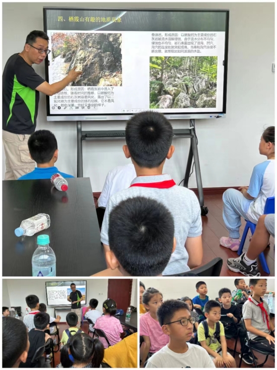 孩子们先在课堂里聆听地质老师的《栖霞山——地质宝库》专题讲座。图文并茂的PPT、老师接地气的讲解,引领孩子们走近栖霞山,帮助他们了解栖霞山特殊的灰岩地质、由灰岩形成的栖霞三宝、有趣的栖霞地质现象及化石等丰富的地质文化,孩子们个个听得津津有味。