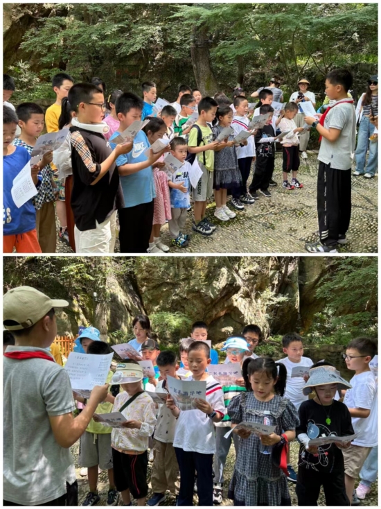 接着,孩子们走进大自然,探寻栖霞山特殊的地质文化奥秘。大家漫步在栖霞山中,沿途听着老师现场解读栖霞灰岩、品外泉、白乳泉以及青峰剑石的地质文化,拓宽了知识,开阔了视野。走一走,看一看,再来读一读,品外泉旁品读几首赞美栖霞山风光的古诗词,进一步品味“第一金陵明秀山”栖霞山的意境,在大自然怀抱中尽享山水林泉之美。