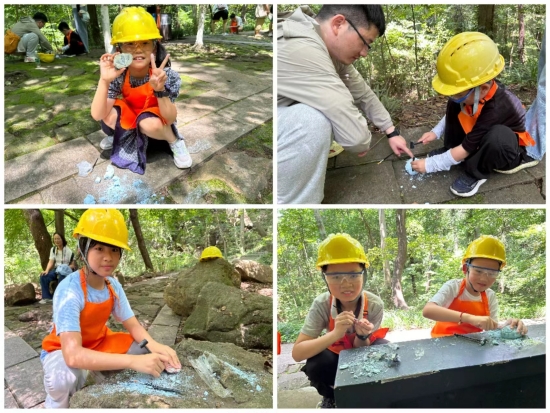 探寻宝藏,是大家最感兴趣的实践活动。孩子们手拿錾子、铁锤、刷子等地质勘探工具对实地寻找到的化石进行敲打、开凿,忙得不亦乐乎。当寻得恐龙蛋、始祖鸟、三叶虫等化石时,孩子们欢呼雀跃,兴奋不已!
