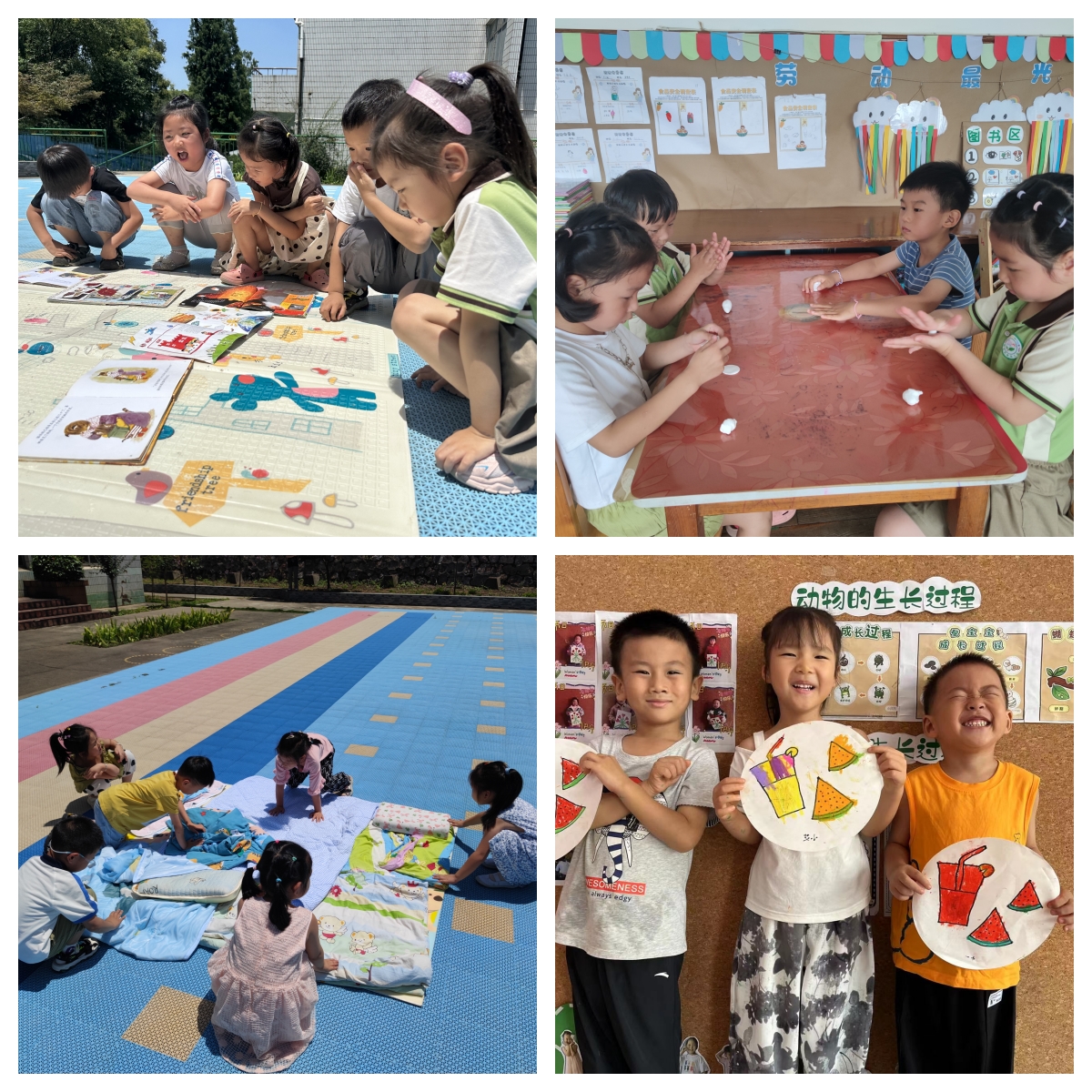 活动中,老师播放《小暑至 盛夏始》视频观看,带领孩子们初步了解小暑节气的由来及民俗:小暑可以晒被子、晒书本,还有吃饺子、吃藕等习俗。老师讲解到小暑有三候:一候温风至;二候蟋蟀居宇;三候鹰始鸷。接着,志愿者带领大家亲近自然,在阳光下晒晒被子与绘本,提升参与积极性,并号召孩子们多多关注周围人、事、物的变化,通过倾听、表达、手工、绘画的方式体验小暑节气。孩子们发挥想象,有的巧手捏彩泥,轻轻扎上小洞,制成圆圆的藕;有的运用油画笔绘画荷花和夏季时令鲜果,体验夏天乐趣。孩子们相互分享交流讨论各自作品,进一步加深对小暑的认知。