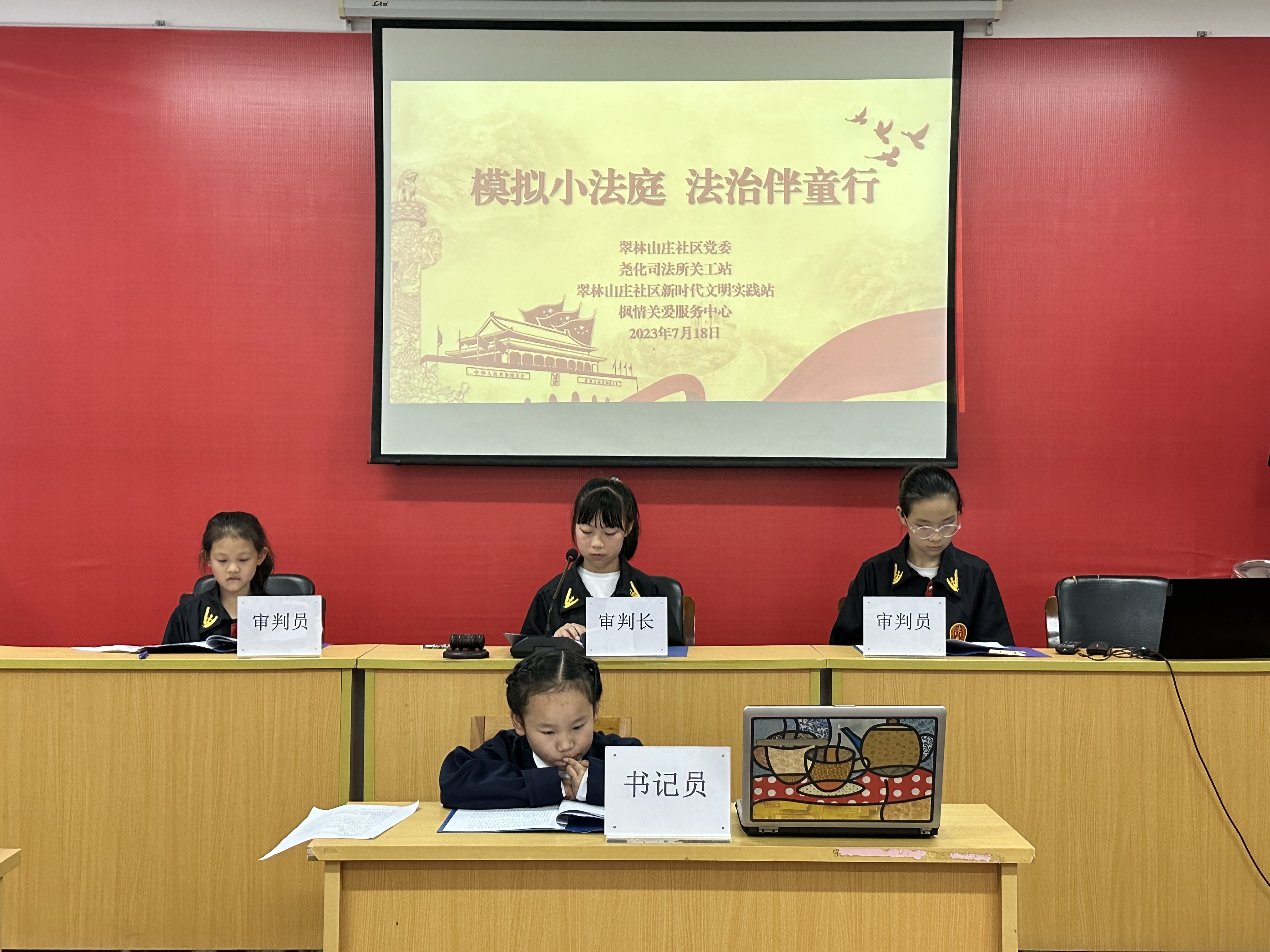为进一步提升未成年人法律意识,加强平安社区,营造未成年人学法、知法的法治氛围,帮助孩子们从小培养职业理想,预防未成年人违法犯罪,保障未成年人健康成长。7月18日,尧化街道未成年人保护工作站联合尧化司法所关工站、翠林山庄社区、枫情关爱服务中心共同开展“模拟小法庭,法治伴童行”——翠林山庄社区法治宣传进社区活动。