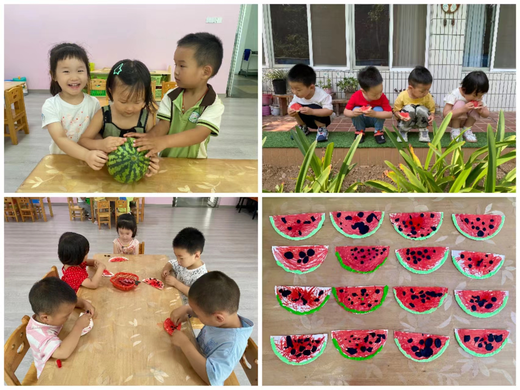 孩子们指着种植基地里大家亲手浇水种植的小西瓜,兴奋极了,叽叽喳喳说个不停。志愿者给大家带来了一个成熟的小西瓜,孩子们近距离观察触摸,大声说出对西瓜的了解:“西瓜是绿色还有黑色,它里面是红色的。西瓜是硬的!”接着,老师带领大家用西瓜玩起了“西瓜接力赛”小游戏,孩子们也开心地用画笔绘制属于自己的西瓜。最后,大家一起互相展示作品,品尝甜甜的西瓜,感受夏日的乐趣。