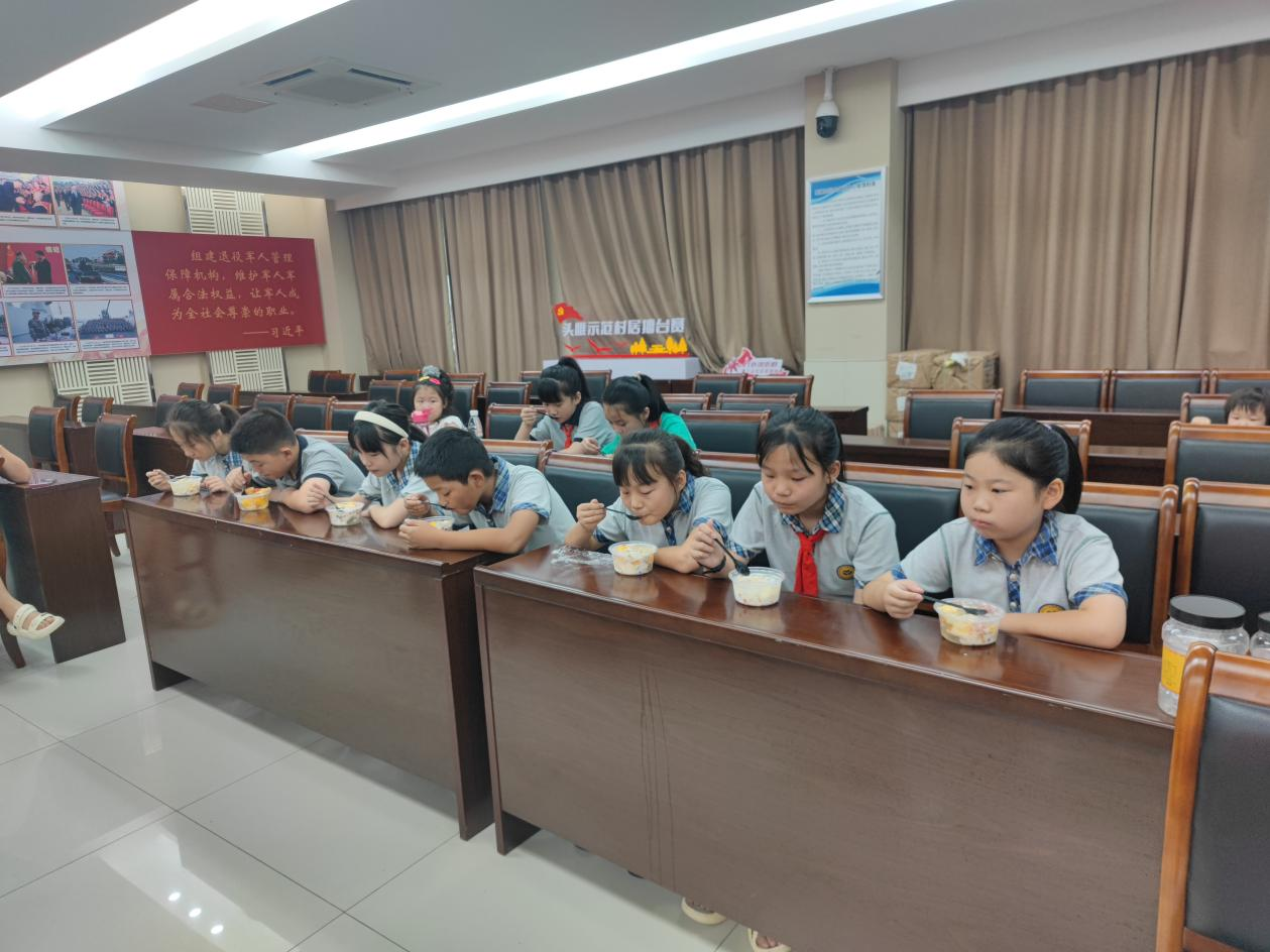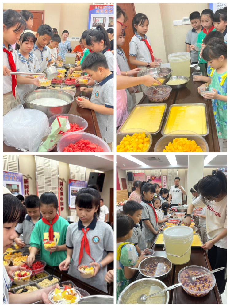 制作完成后,孩子们和小伙伴一起品尝自己的劳动成果,香甜又美味。孩子们还不忘记给辖区内的环卫工人和保洁人员送上解暑的冰粉,为他们送去一丝丝清凉,也感谢他们在炎炎夏日一直默默坚守在自己的岗位上,向他们表示敬意。大家吃着孩子们亲手制作的甜品,脸上纷纷露出了幸福的笑容。