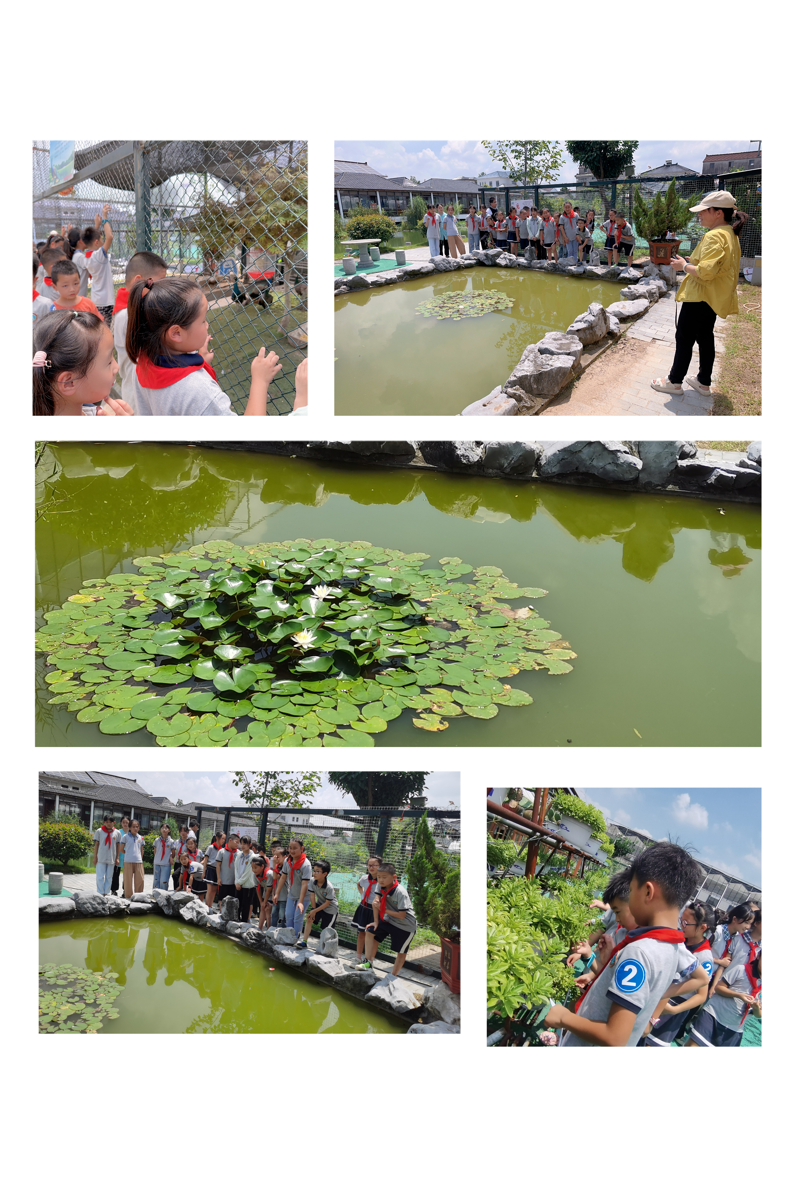 饭后午休,队员们走进小小动物园,活泼的小狗、美丽的孔雀在欢迎大家的到来。驻足小池塘边,那碧绿的莲叶、雪白的莲花在阳光下格外耀眼。