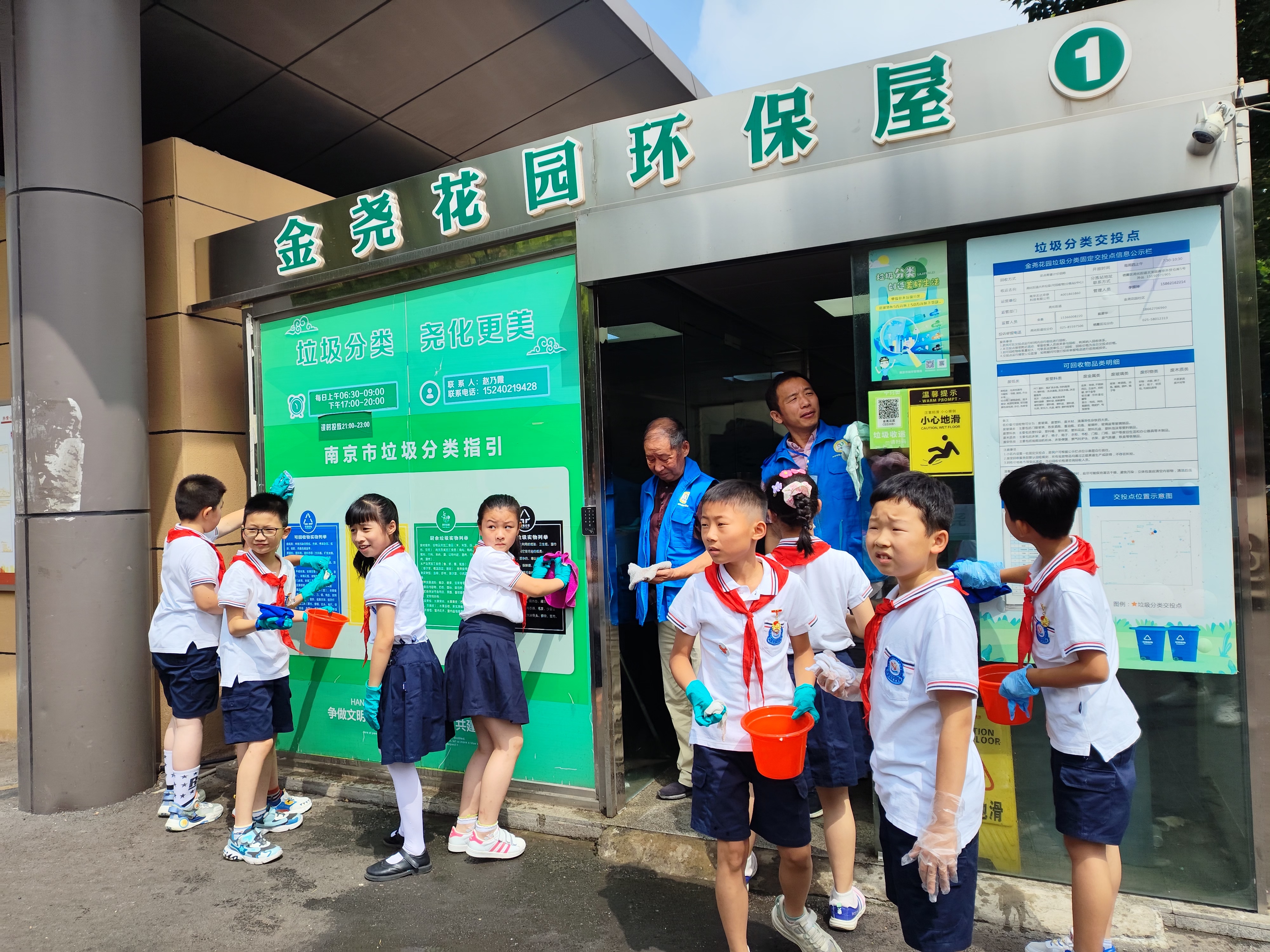 垃圾分类银辉宣讲团讲师通过生动形象的图片,给孩子们讲解垃圾分类知识。活动现场设置垃圾分类游戏体验环节,让孩子们通过所学知识给各类“垃圾”找到“家”,用趣味游戏开启分类新时尚。游戏环节结束后,少先队员们带着垃圾钳、垃圾袋、抹布等工具,化身为“环保小卫士”热火朝天地行动起来,擦拭清洁环保屋积尘,深度清除缝隙污垢,清理路面和绿化带,虽然天气炎热,但孩子们热情不减,个个干劲十足。