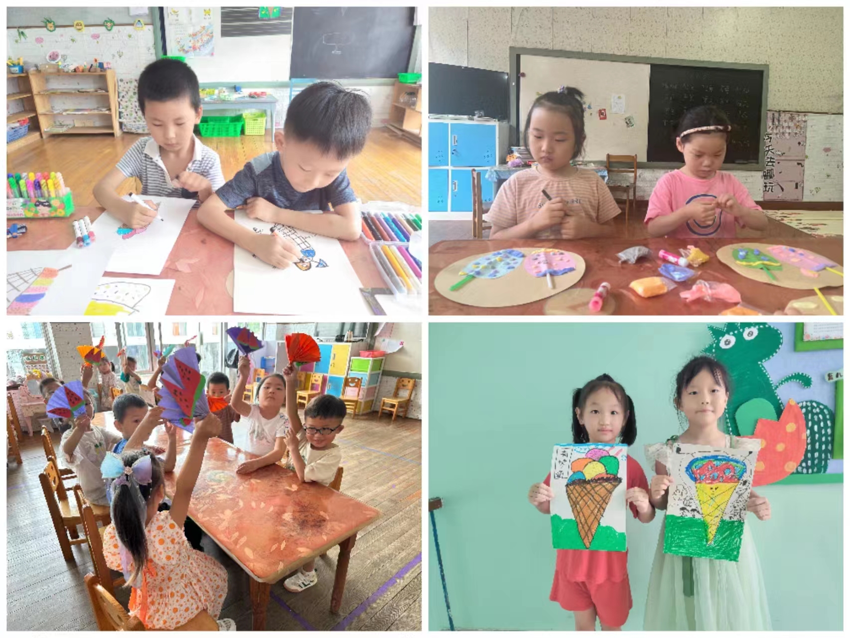 活动中,老师向孩子们讲述大暑节气的由来、习俗及特点:大暑正值“三伏天”,往往是一年中最热的时候,古有“乾坤大暑似蒸坊,垅热风炎鸟兽藏”的诗句,十分形象地描述了伏天气温高,阳气盛的气候特征。接着,老师给大家播放歌曲《冰淇淋》并拿出夏季物品及图片让孩子们观察和描述它们的形状、颜色、质地等信息,调动孩子们的情感和兴趣。稍后,孩子们运用卡纸、颜料、水彩笔、黏土等工具,发挥想象力绘制自己的夏季饮品及纳凉扇。伴着阵阵清凉与果香,也勾起孩子们心中甜蜜的味道。最后,大家共同交流、分享作品。孩子们相互学习和讨论,进一步激发了创作的兴趣,体验到成功的喜悦。