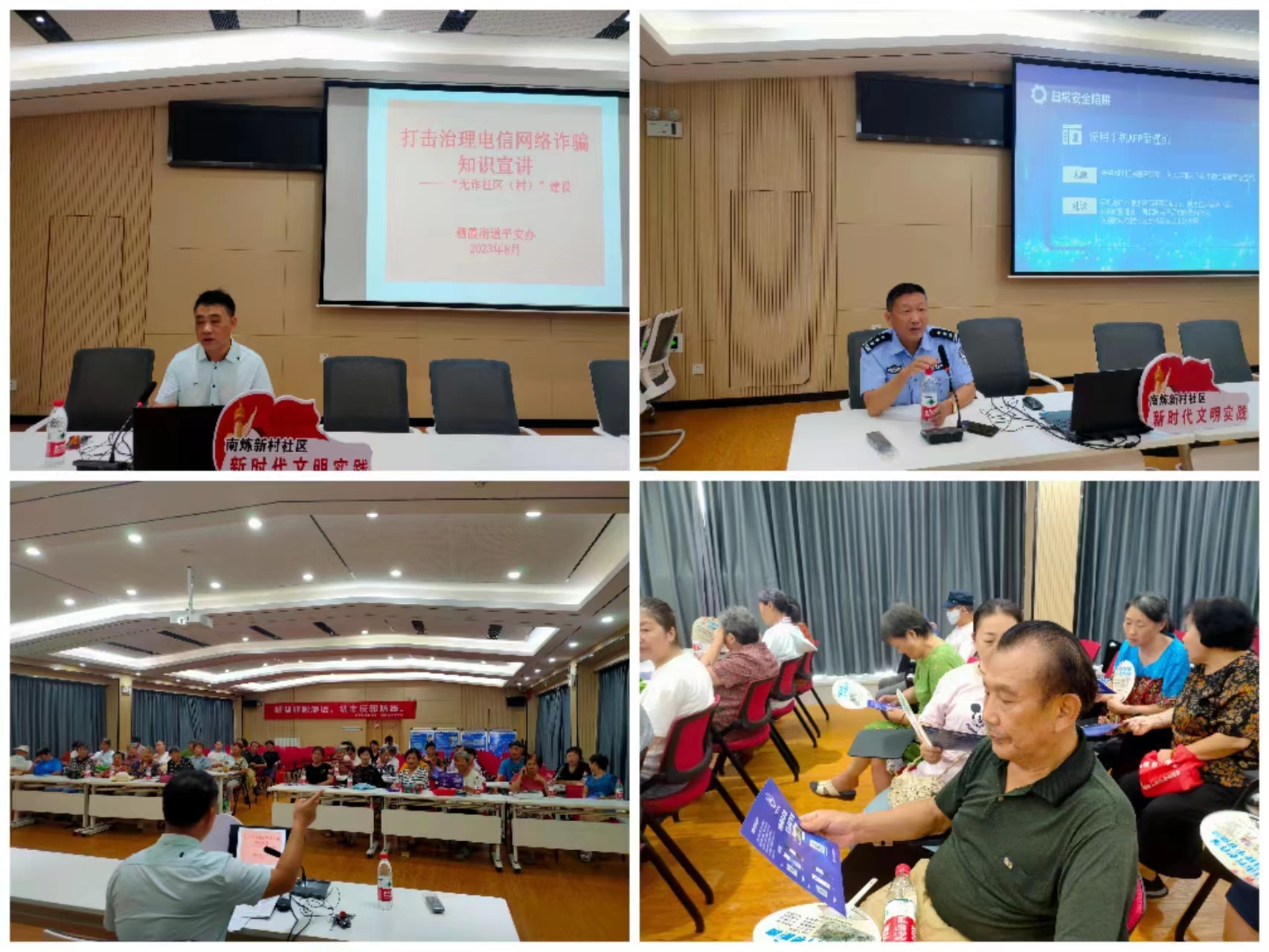 8月17日上午,南炼新村社区居民学校联合街道综治办余科、社区民警黄警官,在社区五楼开展“防电信诈骗、反邪教”知识宣传讲座活动,参加本次活动的有楼栋长、居民代表、党员代表、退役军人代表等。