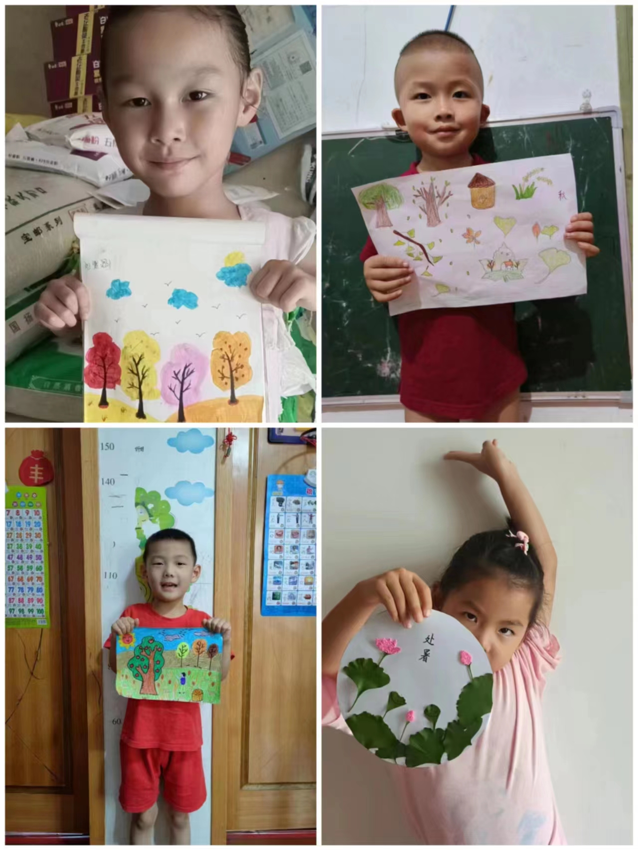 老师通过故事、图片及视频等形式向孩子介绍处暑节气的民俗传说,让孩子们了解节气的特点和意义。处暑,即为“出暑”,是炎热离开的意思,处暑节气意味着即将进入气象意义的秋天,气温逐渐下降。孩子们根据音乐一起做手指律动《处暑歌》:处暑微风阵阵凉,葵花朵朵向阳光。如今已到丰收日,家家户户满地黄。在亲近自然时,孩子们仔细观察,运用水粉、勾线笔、气泡膜等工具,通过倾听、表达、绘画、手工的方式分享交流,体验处暑之趣。
