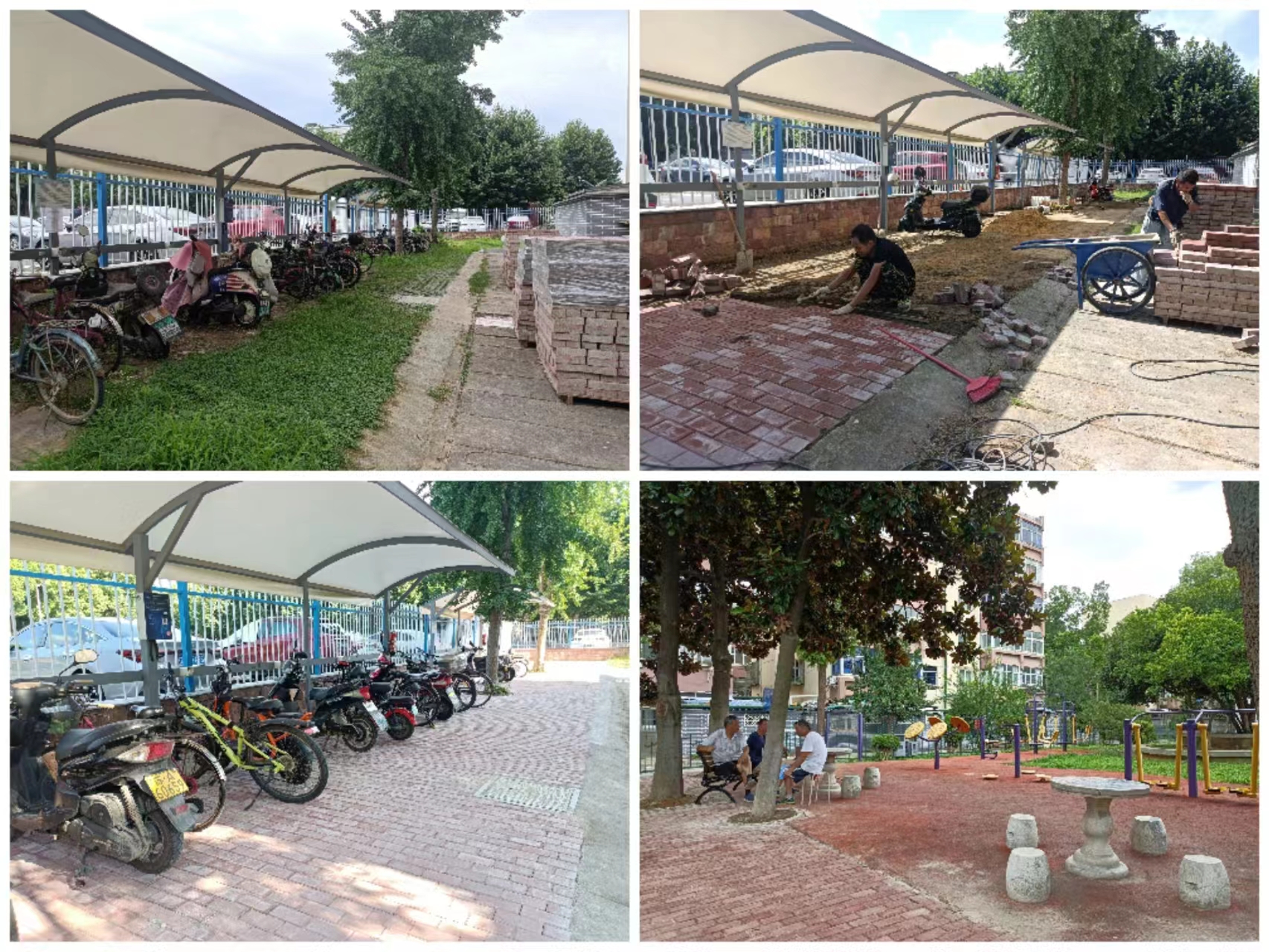 位于小区36栋南边小公园内及63栋东边非机动车棚内的草地花格砖,因夏季高温雨热天气,杂草丛生,生长茂盛,也带来了蚊虫细菌滋生、下雨天泥泞湿滑不便行走等问题。居民出行很不方便,生活居住环境也不理想,尤其辖区内老龄人口居多,存在安全隐患。社区及物业关注居民们的身体健康和实际体验,工作人员随即进行实地勘察,访问调研,综合居民群众的意见和实际情况,对地面草坪砖进行升级改造,铺设面包砖密封固化地坪路面。
