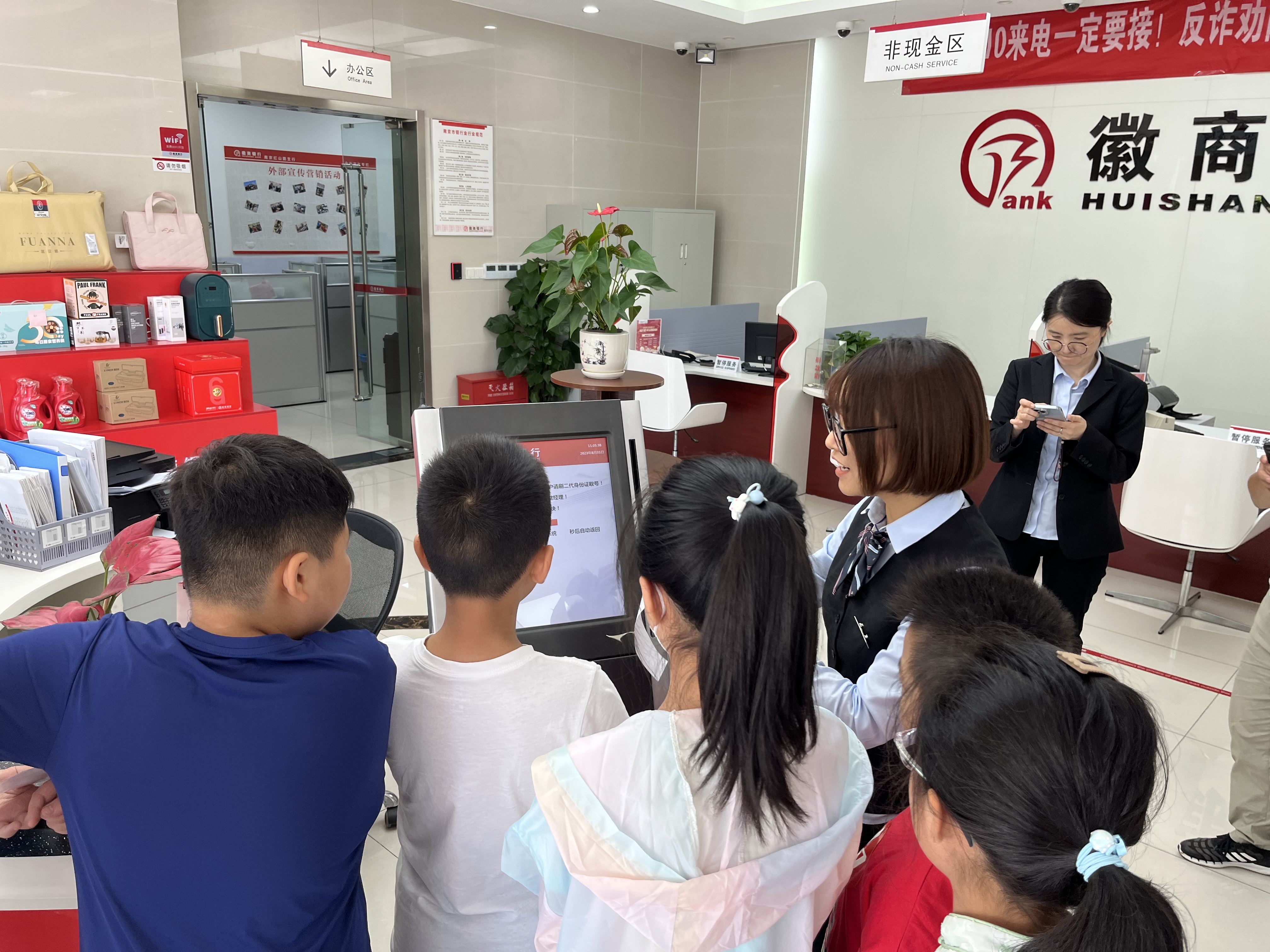 2023年9月4日,十字街社区党委、新时代文明实践站联合红山街道徽商银行红山路支行党支部组织“小小银行家,金融伴成长”文明有宁、携手同行青少年金融知识科普活动,关注青少年教育发展,为进一步引导青少年树立良好的消费观和财富观,切实有效开展金融知识普及教育,孩子们排着队,井然有序地跟着银行工作人员学习各业务办理流程。
