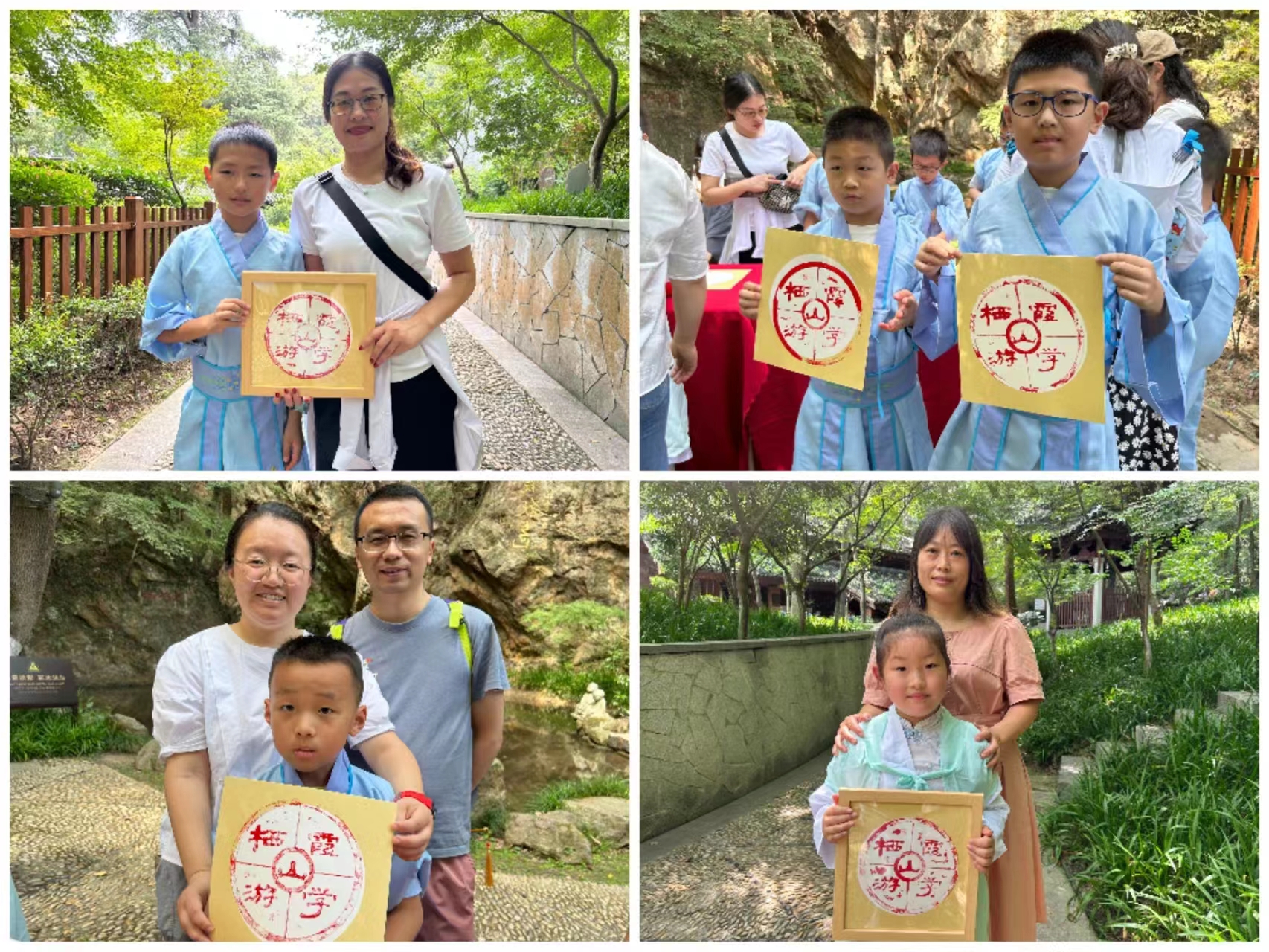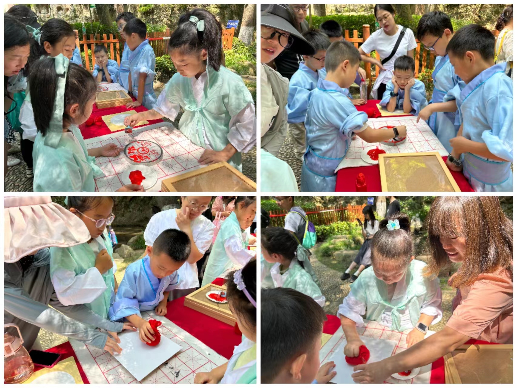 拓片在中国有着悠久的历史。相传,捶拓产生于隋,最早的用途是临摹习字,拓片是集金石、考古、美术三位一体的艺术门类,将古代刻画、浮雕文物拓制于纸上而形成的一门独特的艺术形式延续至今。孩子们对此非常感兴趣,老师一说完拓印的操作技法与注意事项,他们就迫不及待地做起来。你瞧,有默契合作的小伙伴,有积极参与的家长,他们做得多带劲!没多久,“栖霞山游学”作品就出来了!
