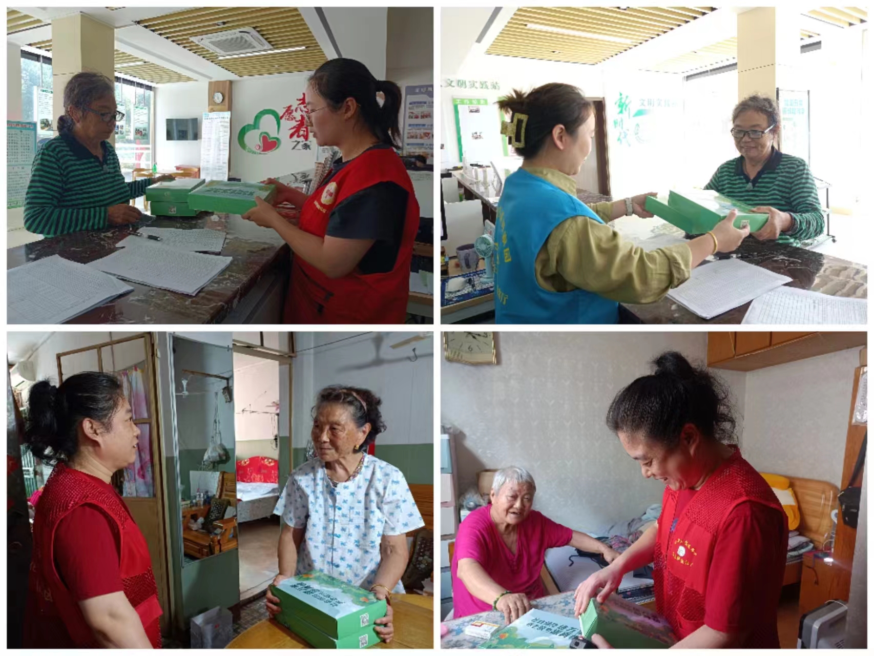 社区劳动保障工作人员在“掌上云社区”微信群及小区宣传栏内发布通知后,退休居民纷纷来到居委会领取清凉用品,新时代文明实践站志愿者现场帮助发放。