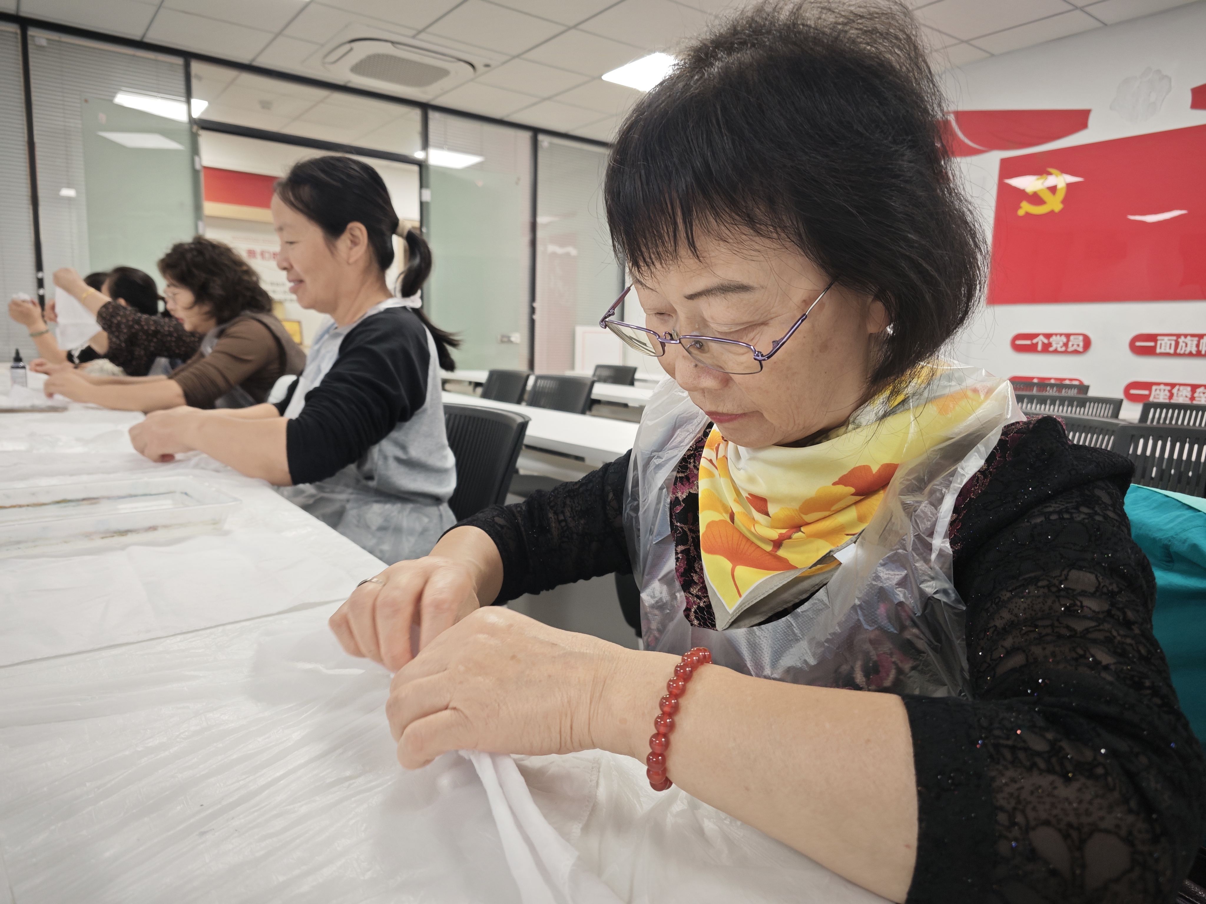 在老师的耐心指导下,居民们兴致勃勃地动手制作属于自己的扎染手绢。大家充分发挥创意,将布料折叠、打结、捆扎,再滴墨,期待惊喜的出现。当一件件独一无二的作品展开时,现场响起阵阵赞叹声。
