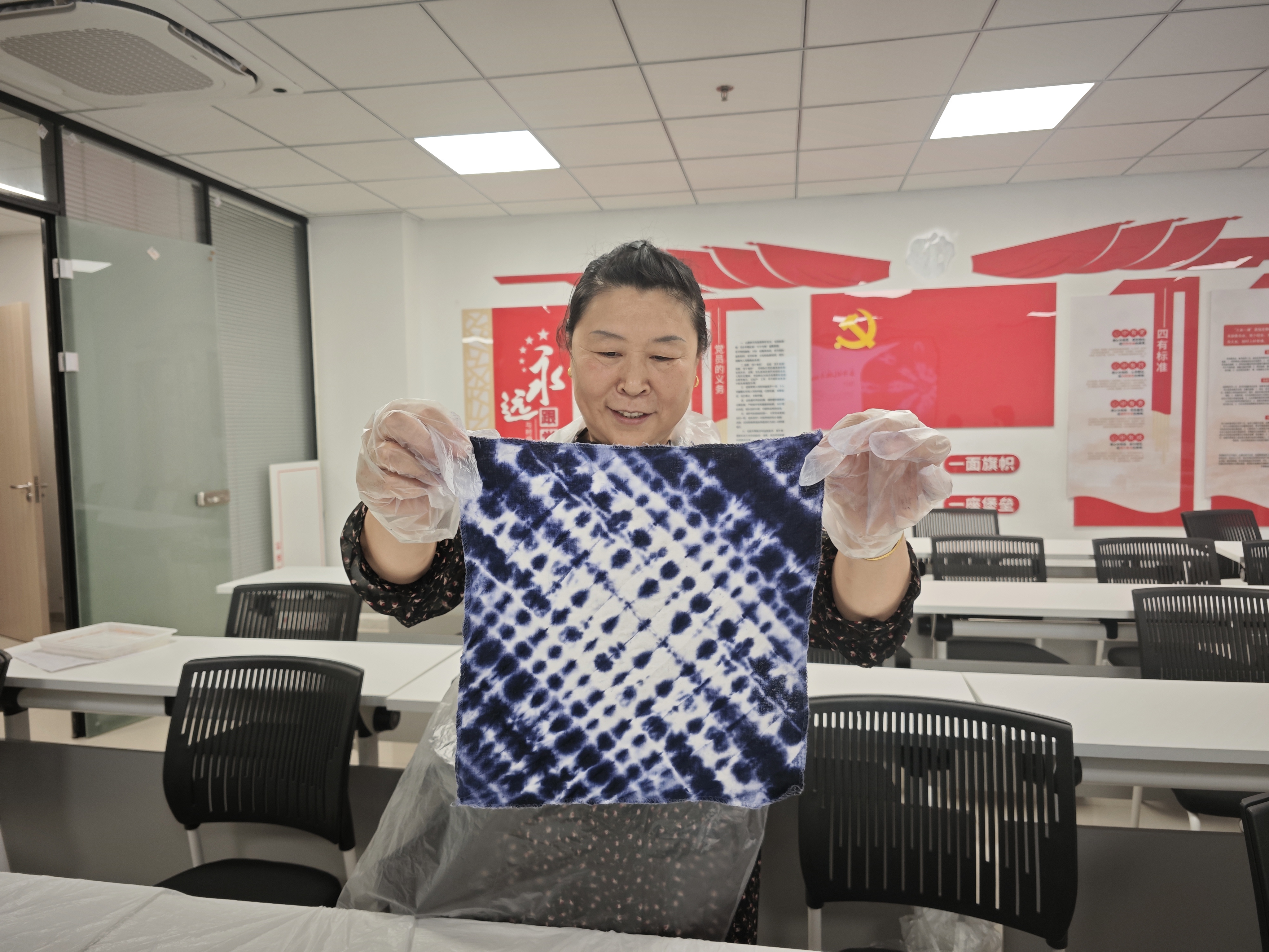 活动吸引了多位辖区居民积极参与。活动伊始,专业老师详细介绍了扎染的起源、发展历程及独特魅力,现场演示了折叠、捆扎、染色等基本技法,并分享了色彩搭配与图案寓意的知识。蓝白相间的晕染之美,让大家深深感受到这项古老工艺的独特韵味。
