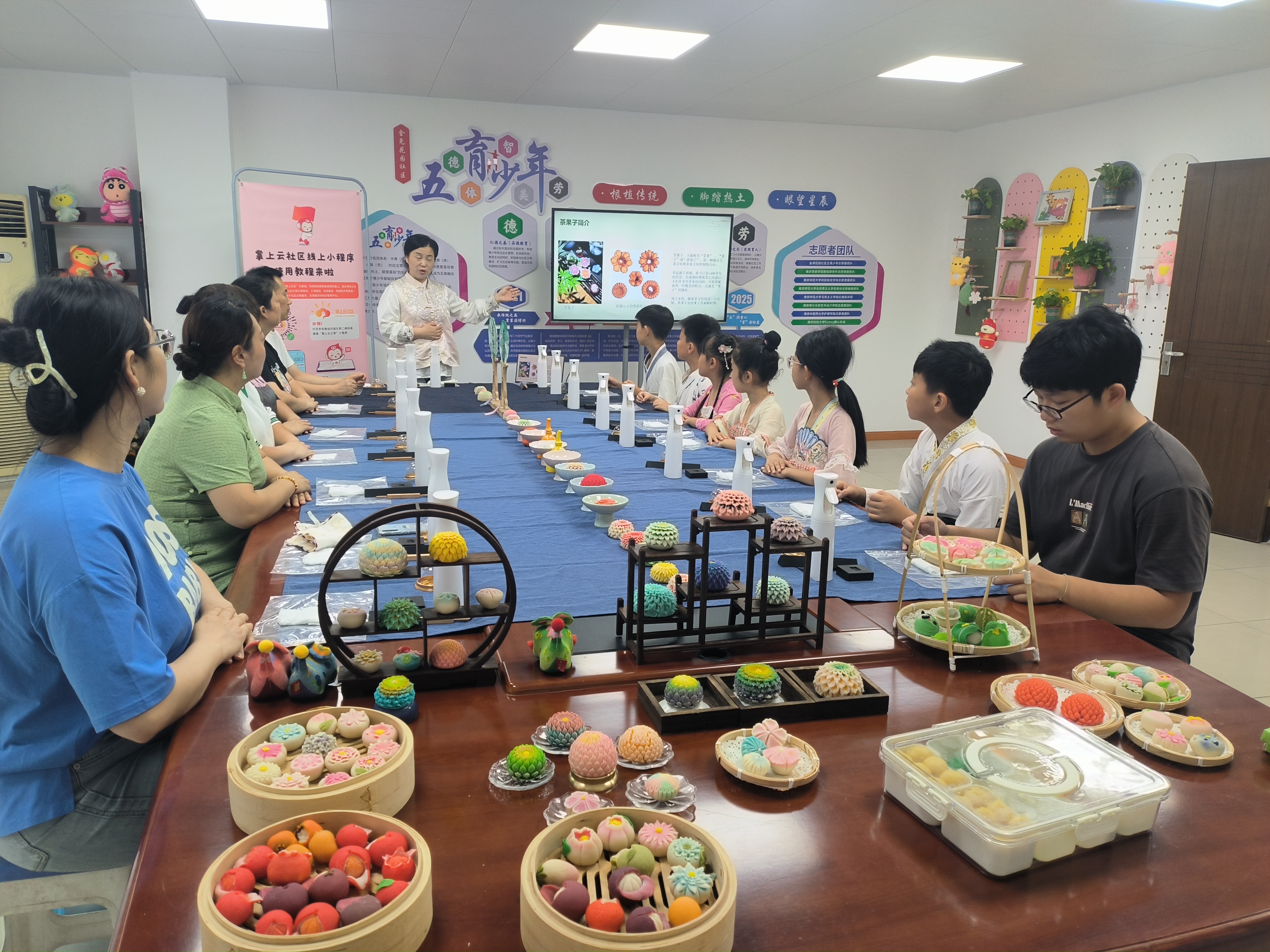 踏入尧化街道金尧花园社区党群服务中心,明亮暖光透窗洒进“五育少年”活动室,孩子们身着汉服围坐桌前,专注聆听社区党员志愿者讲解茶果子的文化由来,还亲手制作出精美的“茶果子”。这一温馨场景,正是10月19日在金尧花园社区开展的“五育少年”为民服务项目的生动缩影。多年来,社区党委以党建赋能,整合资源、优化空间、推动参与,让“五育少年”项目成为连接党群的重要纽带。
