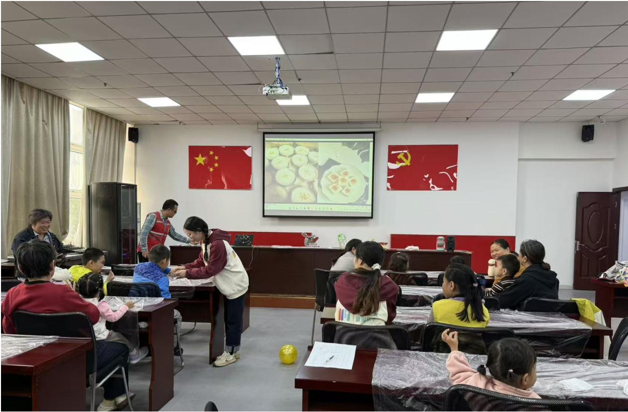 随后,备受期待的重阳糕制作环节正式拉开帷幕。志愿者老师先细致演示制作步骤与技巧,随后小朋友们化身“小小糕点师”,在老师的耐心指导下有序动手操作。从揉制软糯面团,到模具塑形、点缀装饰,孩子们分工协作、创意迸发,现场洋溢着欢声笑语。一个个形态可爱、满含心意的重阳糕在小手中诞生,不仅承载着孩子们的童真巧思,更蕴藏着对长辈的真挚祝福。