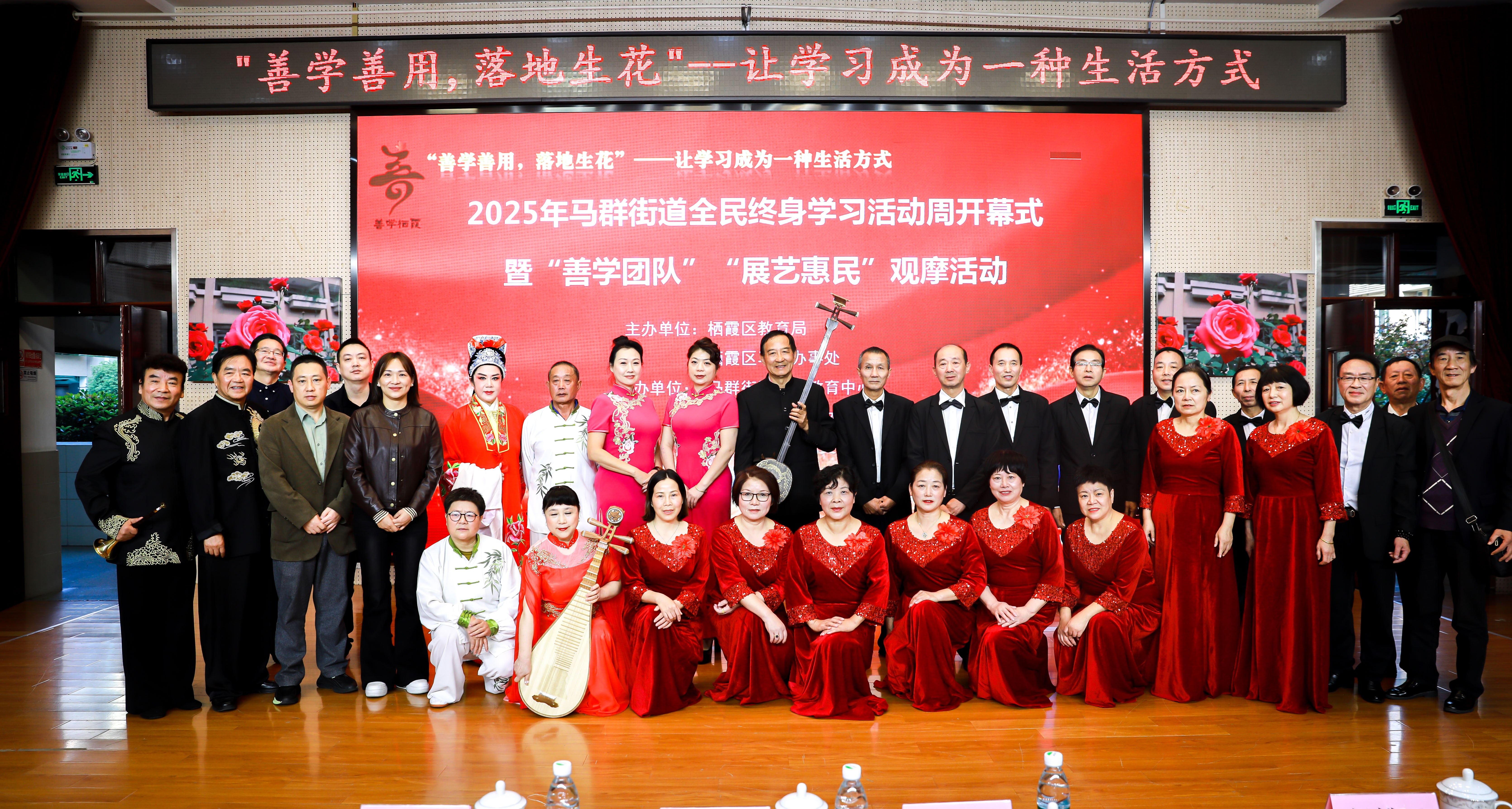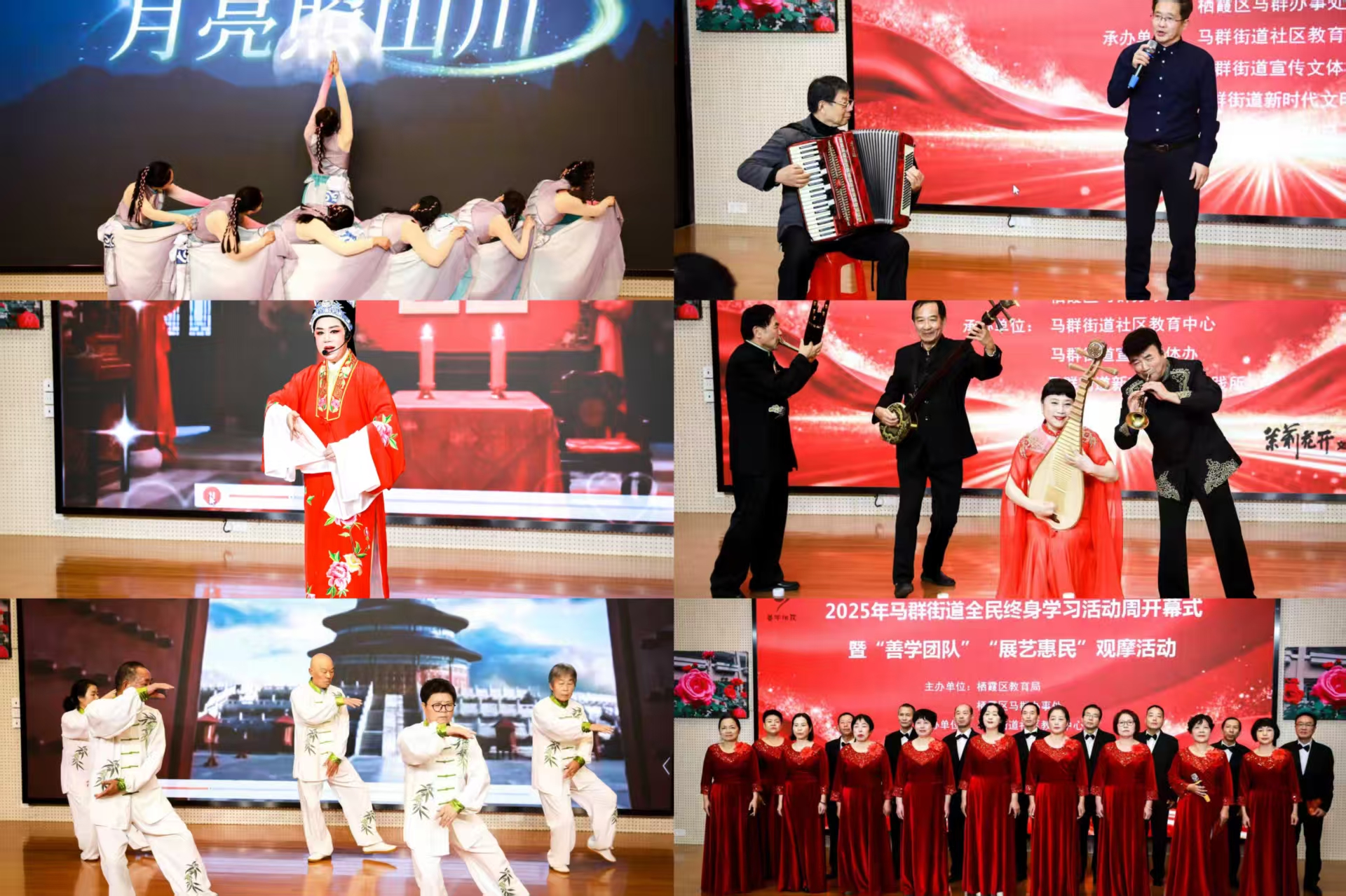 2025年11月5日下午,栖霞区第七场社区教育观摩活动在南京市花港第一小学阶梯教室成功举行。本次活动以“善学善用,落地生花——让学习成为一种生活方式”为主题,将马群街道全民终身学习活动周开幕式与善学团队“展艺惠民”成果展有机融合,通过表彰先进、展演成果、启动仪式的多元形式,全面呈现了马群街道在推进全民终身学习方面的丰硕成果与蓬勃活力。