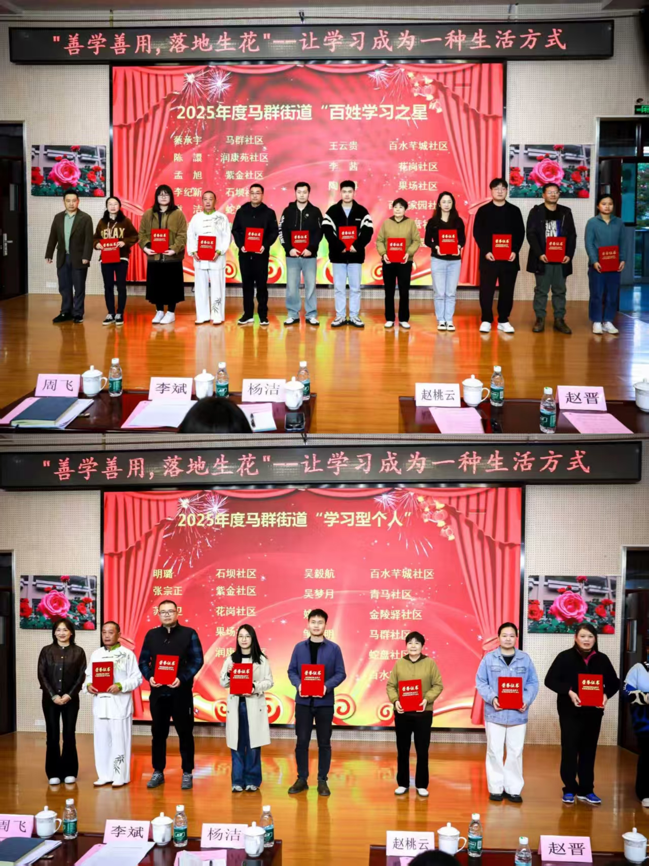 接着,活动进入表彰环节。大会先后公布了2025年度马群街道“社区教育优秀志愿者”“百姓学习之星”“学习型个人”“学习型家庭”及“学习型组织”名单。受表彰的个人、家庭和组织代表依次上台领奖,他们长期坚持学习、热心社区教育、帮携邻里共进的感人事迹,赢得了现场观众的阵阵掌声。