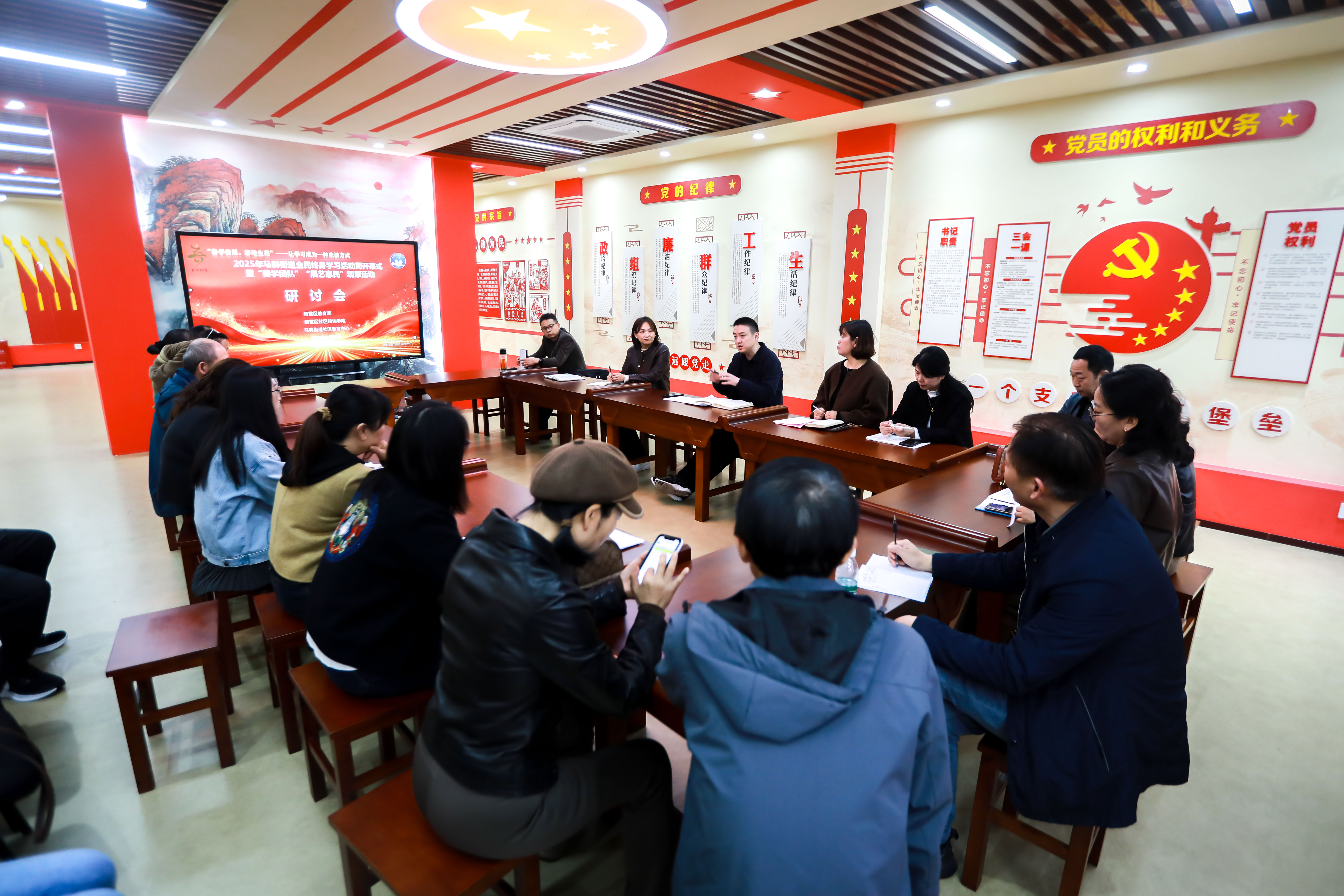 活动结束后,与会领导和教师移步会议室进行集中研讨,会议由栖霞区社区培训学院杨洁副校长主持。马群街道社区教育中心钱广文校长介绍了活动的策划思路。与会人员一致认为,马群街道能将全民终身学习活动周开幕式和“善学团队”成果展示相融合,通过“展艺惠民”这一生动形式,成功探索了将学习成果反哺社区、服务居民的有效路径。