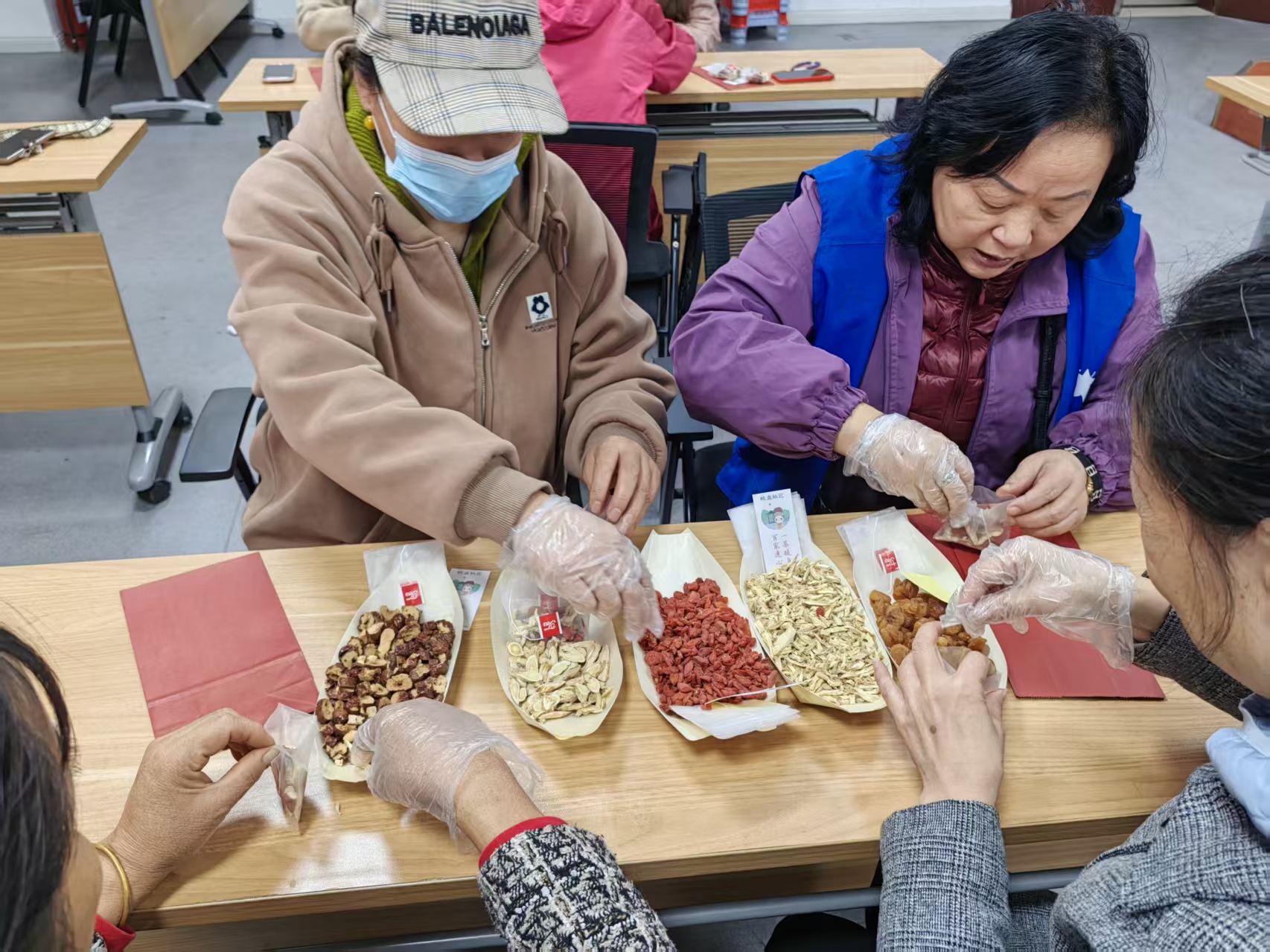 在暖身茶制作环节,志愿者分组协作,共同完成了50份具有冬季养生功效的茶包。每一份茶包均配有印有佘婆卡通形象与“一茶暖身,百家连心”标语的定制包装,参与者还亲手贴上剪纸、写下祝福语,将心意融入其中。
