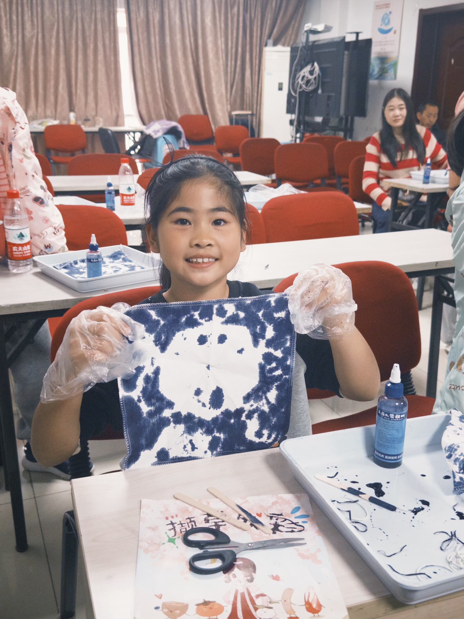 在非遗扎染体验环节。志愿者现场示范“云纹扎法”“鱼鳞捆扎”等传统技法,孩子们在家长协助下,用皮筋、木夹、线绳等工具将白方巾扎出千变万化的造型。“我的像五角星!”“这个像海底世界!”当染料缓缓渗入布料,解绑后的方巾逐渐显露出独一无二的蓝白纹样时,孩子们的欢呼声此起彼伏。活动最后发放的《本草知识》宣传册,不仅收录常见中药功效与养生知识,更附有简易香囊制作指南,将文化体验进一步延伸至家庭场景。