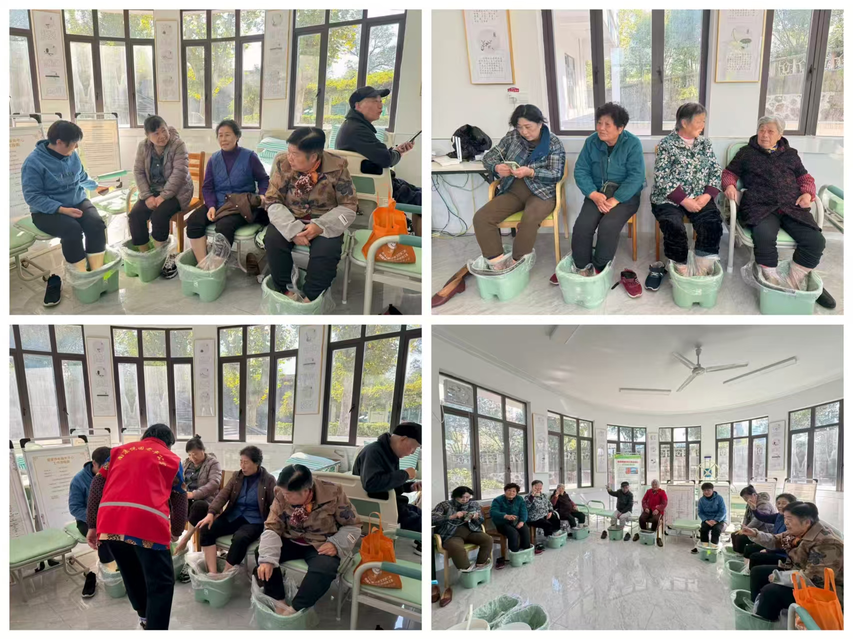 活动伊始,居民学校工作人员与站点志愿者早早做好准备:提前制作好由艾叶、生姜、红花等多种中草药调配而成的足浴汤,整齐摆放好座椅、足浴盆等用品,并仔细检查现场设施,确保老人们的参与安全。活动现场,工作人员首先用通俗易懂的语言为老人们讲解了中药足浴的养生原理,同时还分享了日常足浴的注意事项,包括水温控制、泡脚时长等实用知识。讲解结束后,老人们脱去鞋袜,志愿者贴心地为老人们调试水温。温热的中药足浴汤包裹着双脚,暖意顺着足底蔓延至全身,大家的脸上露出舒适惬意的笑容。“这脚泡的真舒服,暖乎乎的,浑身都放松了!” 今年78岁的张阿姨和身边的老伙伴们开心地分享感受。邻里们互相拉家常、话近况,询问身体状况,现场充满了欢声笑语。老人们纷纷表示,此次活动不仅让他们感受到了中药养生的神奇功效,更感受到了社区对老年人的关怀与温暖,希望今后能多开展此类实用又贴心的活动。