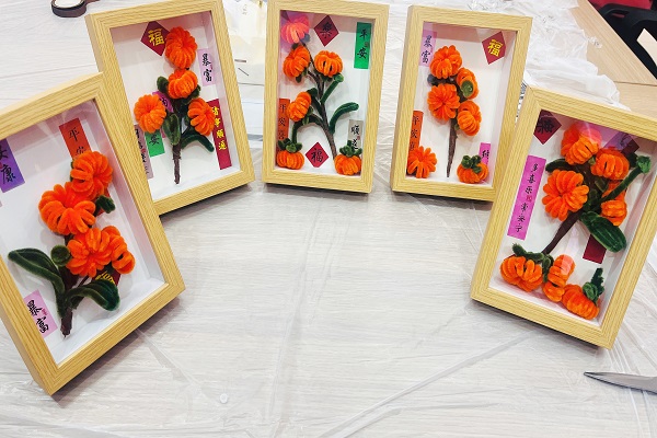 活动开始后,志愿者先为居民讲解了“柿柿如意相框画”的制作步骤,从扭扭棒的造型塑造,到小柿子的组装,再到如何固定到相框中,每一个细节都讲解细致又耐心,考虑到大家动手速度稍缓,志愿者还一对一进行指导,手把手带着完成基础造型的制作。现场氛围热闹又温馨,居民一边跟着步骤制作,一边和身边的伙伴交流技巧,不时传来阵阵笑声。经过近一个小时的创作,一个个形态可爱的小柿子逐渐成型,被小心地固定在相框中。居民捧着自己的作品合影留念,脸上都带着满满的成就感。