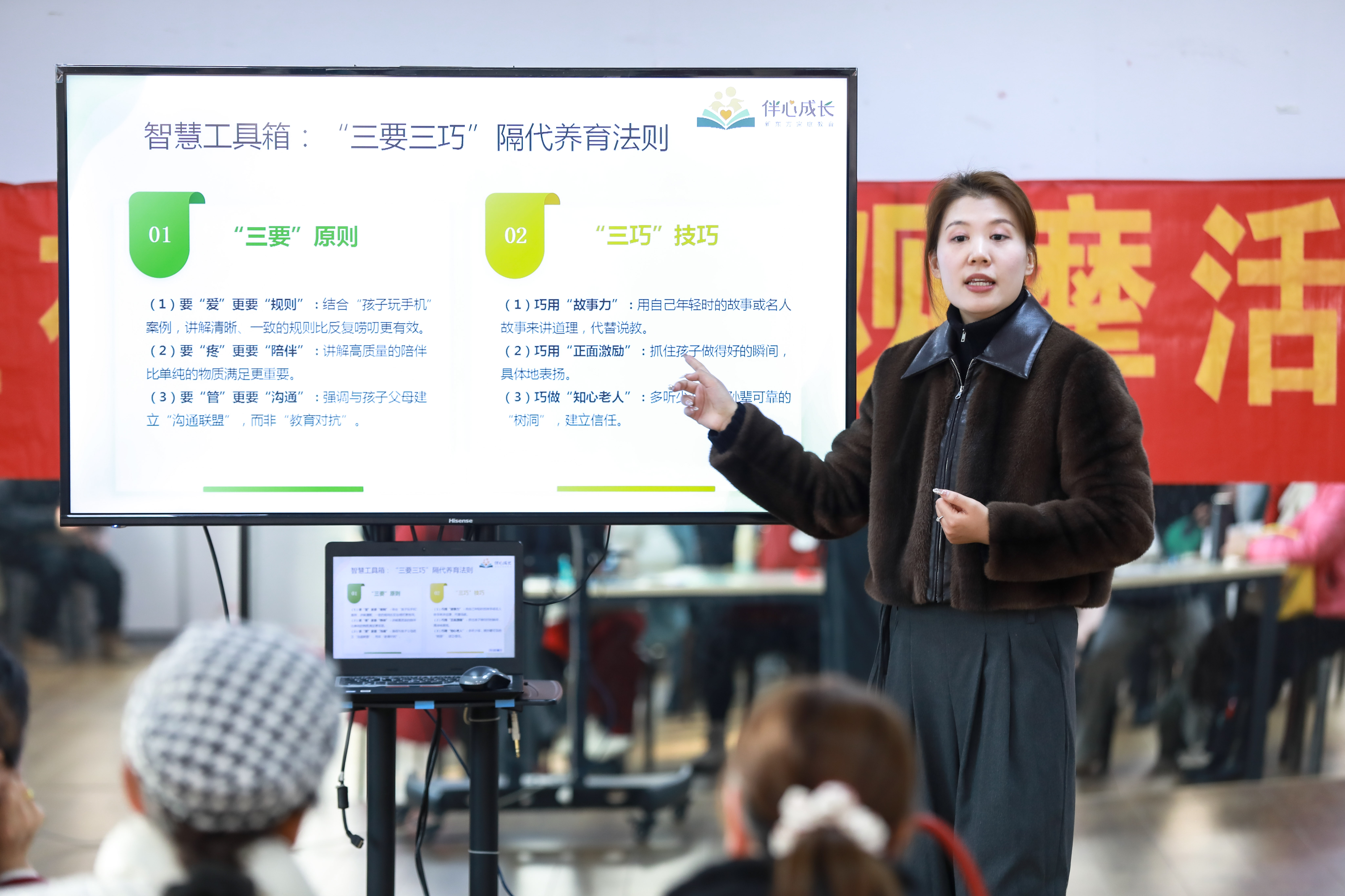 下午2时30分,活动准时开始。在简短而热烈的开场致辞后,与会人员现场观摩了以“智慧祖辈,幸福隔代”为主题的社区家庭教育互动工作坊。工作坊围绕隔代沟通、教养方式、养育法则等祖辈家长关心的实际问题,通过案例分享、情景模拟、小组讨论、手工制作等生动形式,引导参与者展开深度互动。现场气氛温馨而活跃,传统养育智慧与现代科学理念在交流中碰撞融合,展现了社区教育在服务家庭、凝聚共识方面的独特作用。