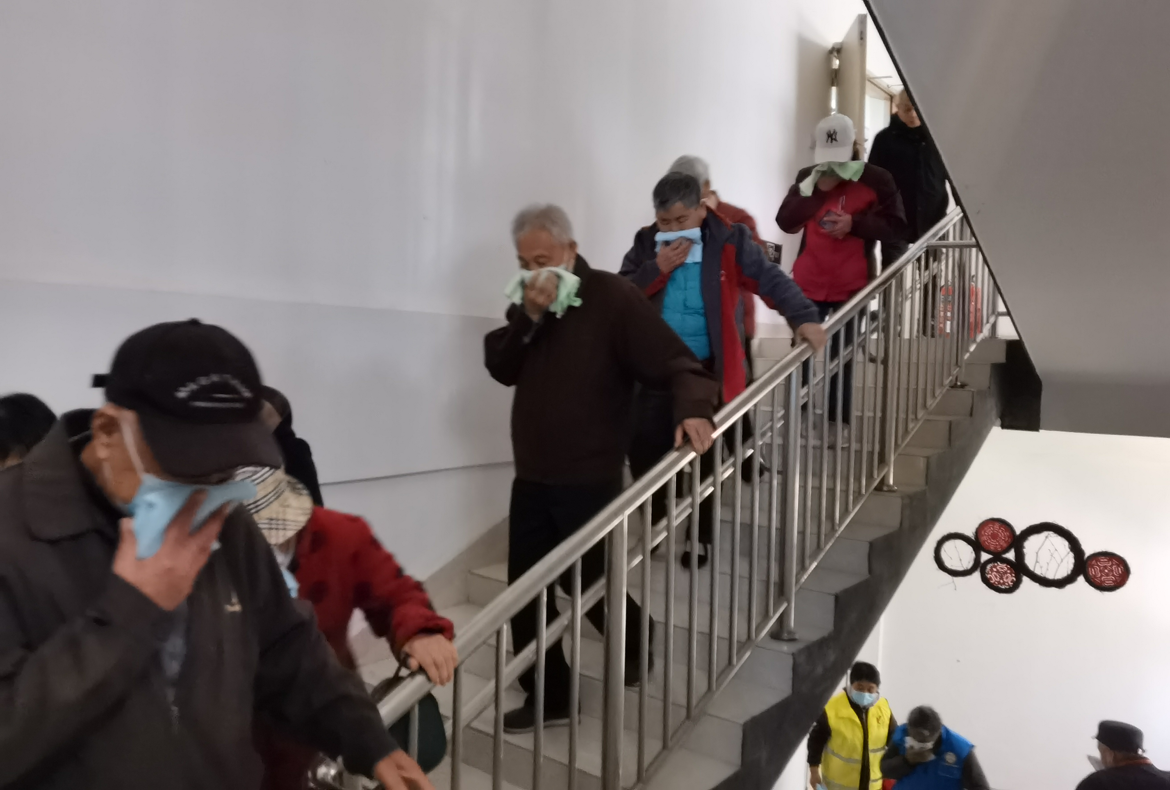 随后,在社区居家养老服务站开展了应急逃生演练,警报声响起后,居民们按照科普志愿者在课堂上的讲解的重点,俯身低头、用毛巾捂住鼻子井然有序沿着安全通道紧急疏散。通过实地演练让居民们了解消防逃生的方法,以及如何有序、迅速地离开火灾现场。通过实景演练,站点活动老人的安全应急处置能力得到了提升,受到了社区老人的一致好评。