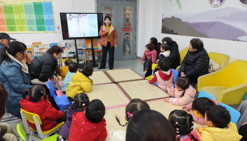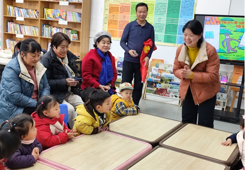 仙林街道社区教育中心曹金花校长精心挑选了《饥饿的老狼和猪的小镇》《想吃苹果的鼠小弟》两本经典绘本,用生动的方式带领孩子们走进故事。曹校长一边引导孩子们观察绘本插图,从画面细节里发现线索,一边适时抛出趣味问题引导思考,鼓励孩子们模仿动物角色的说话语气。萌娃们目不转睛地聆听故事,家长们陪伴在侧,共同享受温馨的亲子时光。