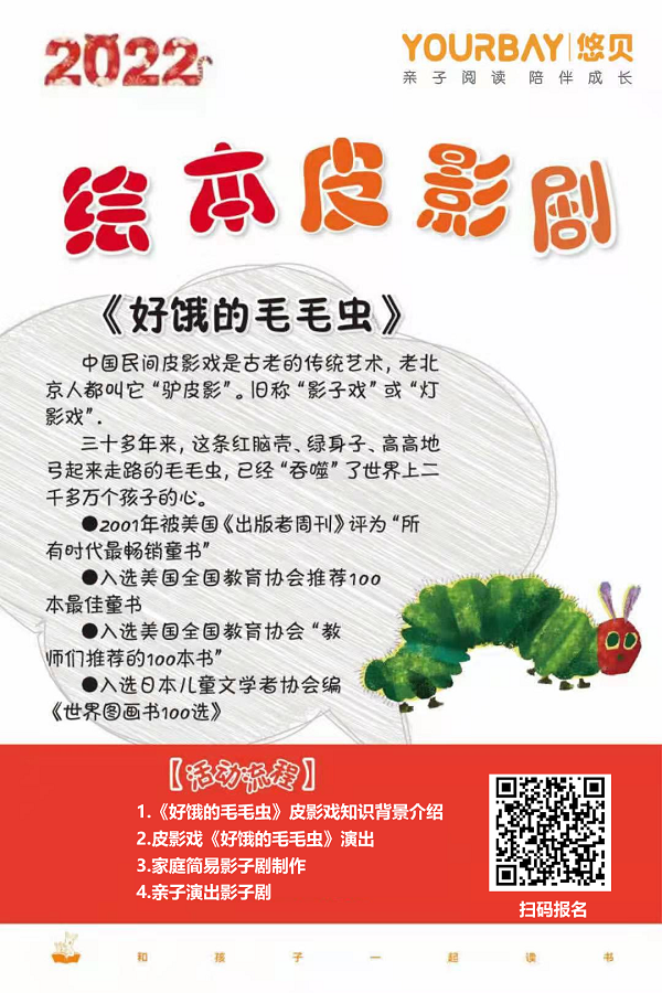 为了让孩子们更深刻的体验中华民族传统民间艺术,发挥创造力,提升好奇心和学习力、提升文化自信,栖霞区西岗街道社区教育中心、齐民路社区联合悠贝亲子图书馆的老师们将经典绘本《好饿的毛毛虫》与经典皮影戏结合,创作了一部精彩的绘本皮影戏。