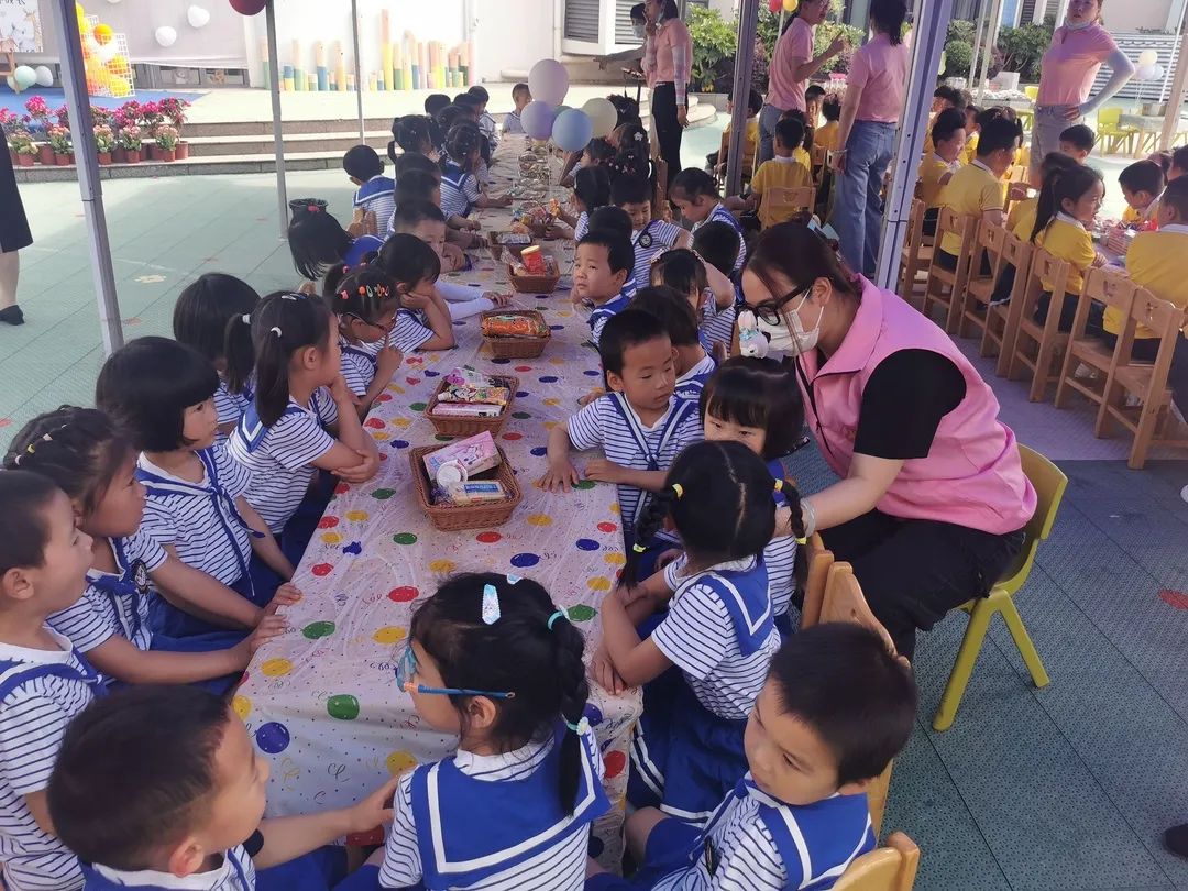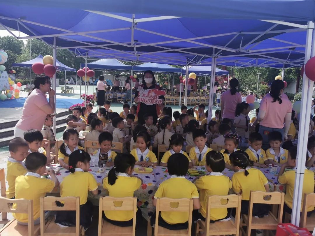 在孩子们的期待中,活动开始了。各班的孩子身着统一的班服,来到园区的广场,坐在帐篷下的长桌边,志愿者们为他们挑选喜欢的零食,和小朋友们一起进行唱歌接龙游戏和趣味知识问答,通过抢答游戏向孩子们普及垃圾分类、端午传统民俗故事、全民阅读的小知识。接着,在表演环节,一个一个精彩的节目,让孩子们看得目不转睛,掌声连连。