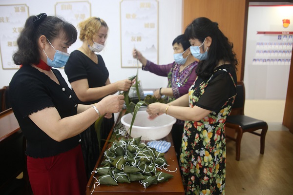 社区志愿者早早地来到齐民路活动室,淘糯米、擦粽叶、裹粽子,在一片欢声笑语中,在一双双灵巧的手中,不同形状的粽子不一会儿就裹好了,有四角粽、牛角粽、宝塔粽等等。放进锅里,不一会儿粽叶飘香,志愿者给每个小朋友都送上了粽子,小朋友拿着粽子,带着五彩手环,感受浓浓的端午节气氛。