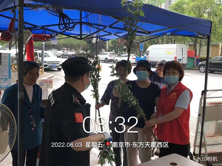 上午工作人员和志愿者们在东方天郡小区门口,为居民发放精心挑选的艾叶,一个一个捆好,亲手送到居民手里,得到居民的称赞。