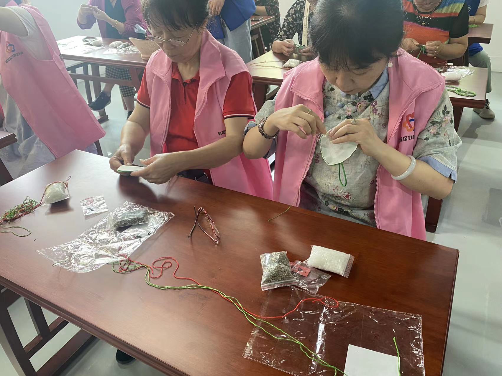 6月2日上午9点30分,燕子矶街道社区教育中心邀请了南京博物院老师到南化新村社区居民学校开展了一场“扬传统文化,说故事,做香囊”文化活动。活动开始,来自南京博物院社会服务部的李蔚瑶老师首先选取了屈原《离骚》中的经典名句,带领大家一起诵读。随后就本地的端午节多种经典传统习俗进行了生动、细致的阐述,和大家一起讨论了端午门头“两不挂四讲究”的插艾说法。最后老师们带领大家一起制作香囊,老师首先讲解了香囊制作的具体步骤,制作过程中大家相互交流、分享。不一会儿,香囊就活灵活现起来,看着自己亲手制作的香囊,每个党员和居民的脸上都洋溢着笑脸,党员居民都有很强的参与感和成就感。