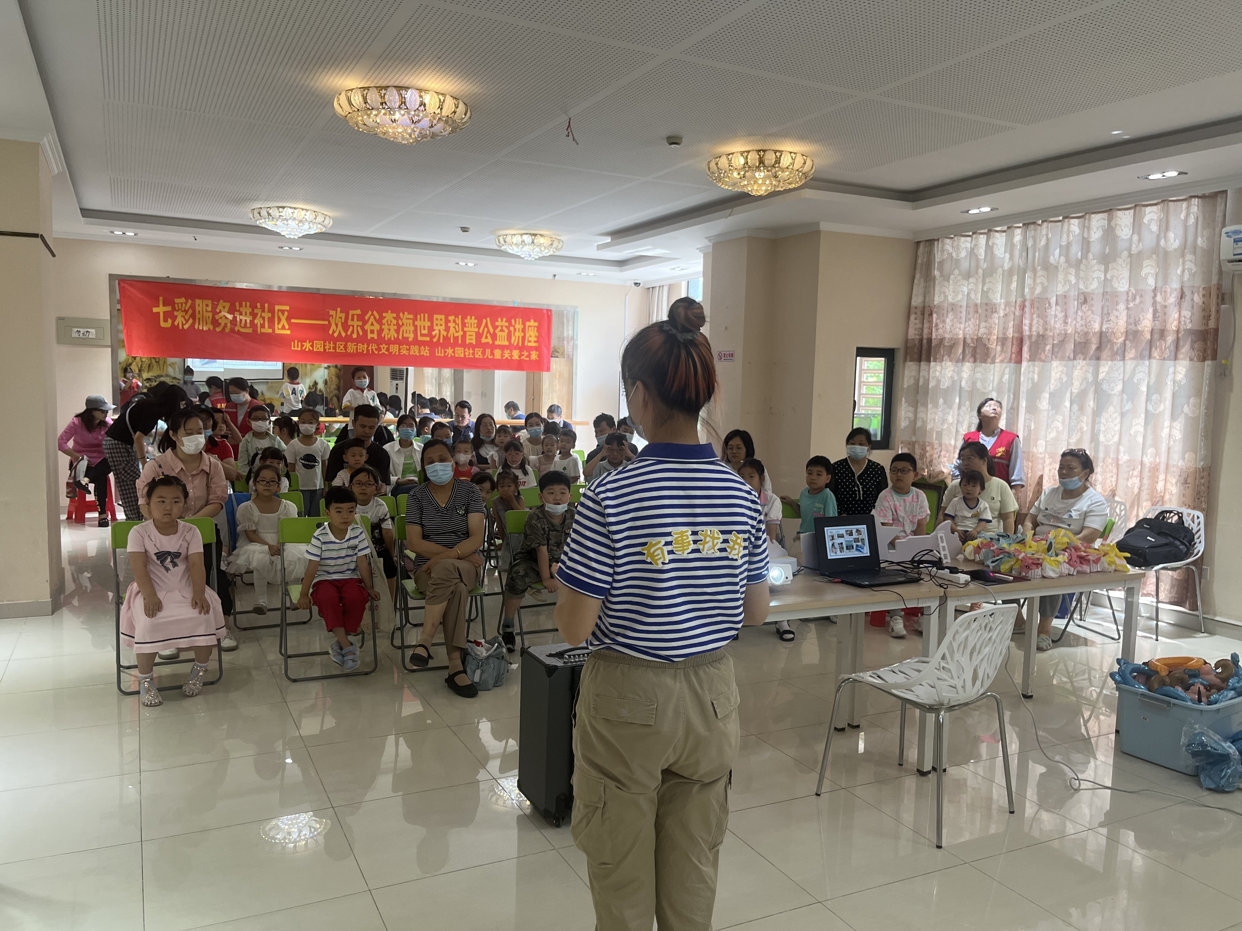 山水园社区儿童关爱之家森海世界公益讲座开讲啦!为普及野生动物保护宣传,提高未成年儿童的生态环境保护理念,南京欢乐谷科普宣讲队于6月11日上午在山水园社区儿童“关爱之家”开展森海世界科普公益讲堂,为儿童们带来了一场森林、海洋生物科普盛宴。
