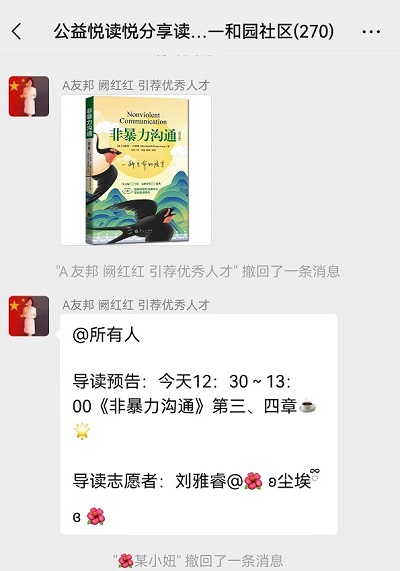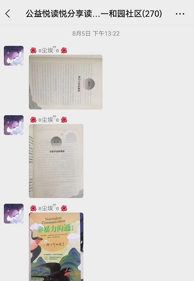本次活动,由导读志愿者带领大家一起分享《非暴力沟通》这本书的第三、第四章。志愿者首先由几个小故事引出书中内容,再带领大家感悟书中内涵,把书中的知识具体应用到实际生活中,理论联系实际,大家津津有味地倾听,纷纷表示这样的读书会使人受益匪浅。接下来,大家互相交流读书心得,感受阅读的快乐,在浓浓的书香中,体会着读书的乐趣。