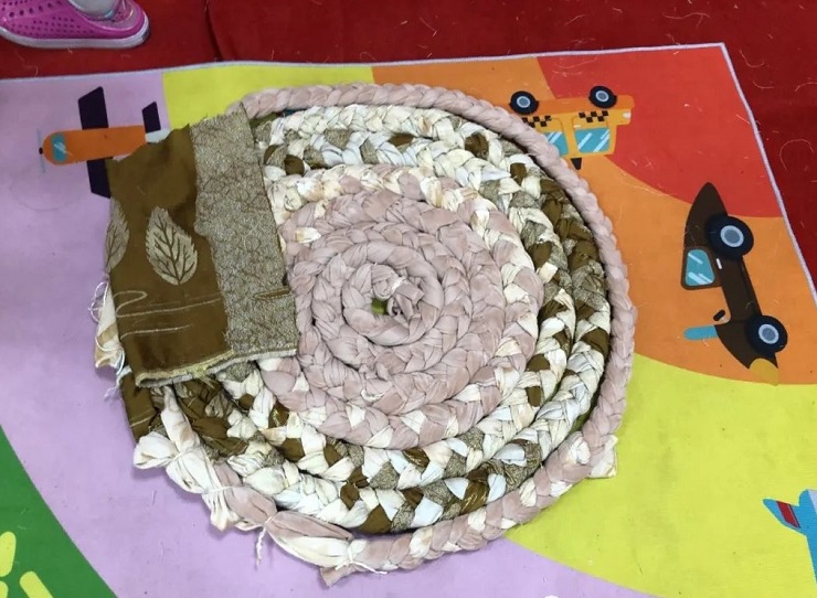 孩子与家长相互合作,一份份布料被揉搓成线绳,从裁剪到编制,再到绕圈、固定,在一双双灵巧的小手之间缠绕起舞。各色的线绳渐渐盘绕起来,从小圈变成大圈,从小圆变成大圆,美丽的纹案也随之显现。大家全心全意投入到这神奇的手工艺术中,专注于手中渐趋成形的小小地垫。