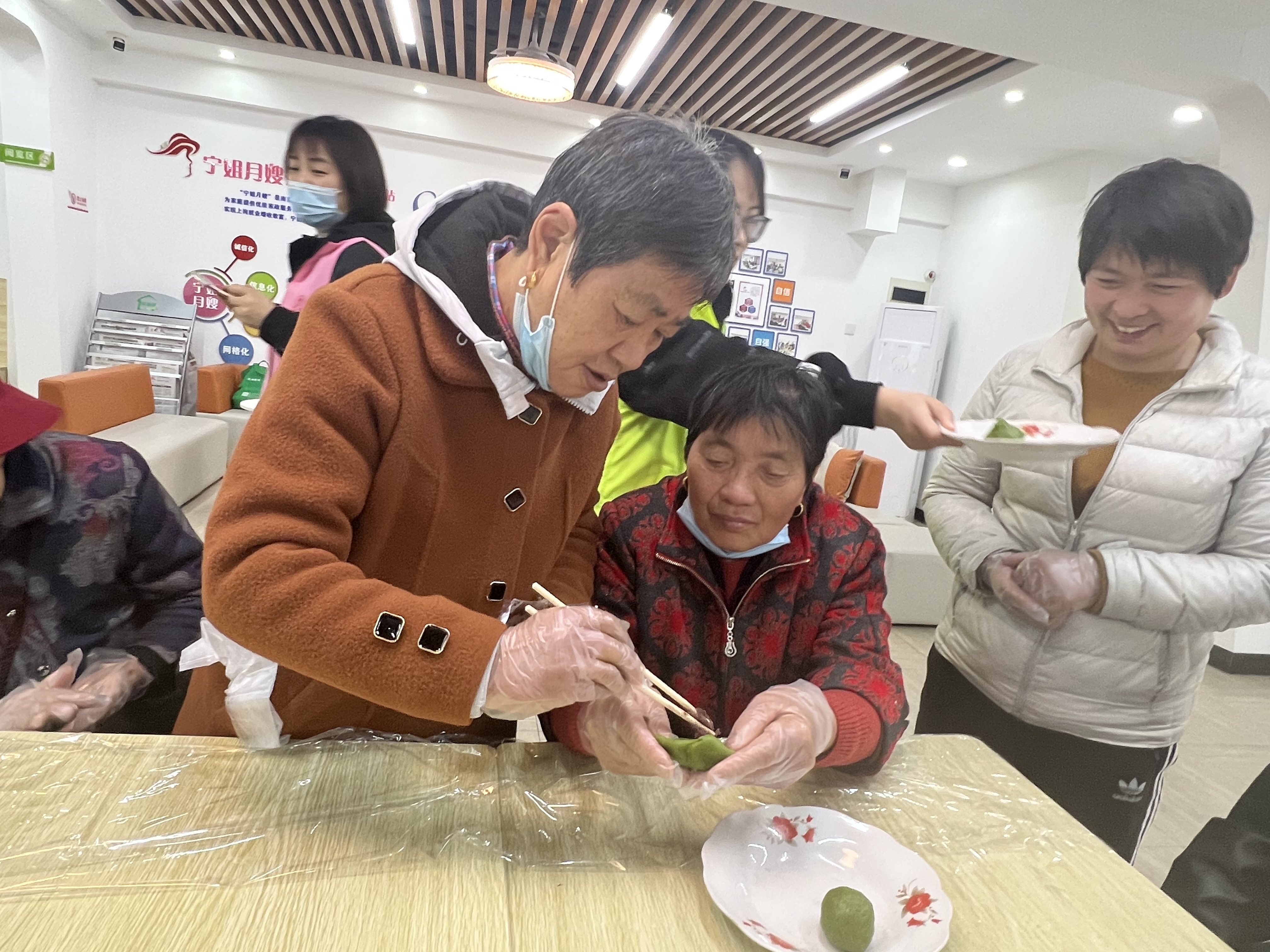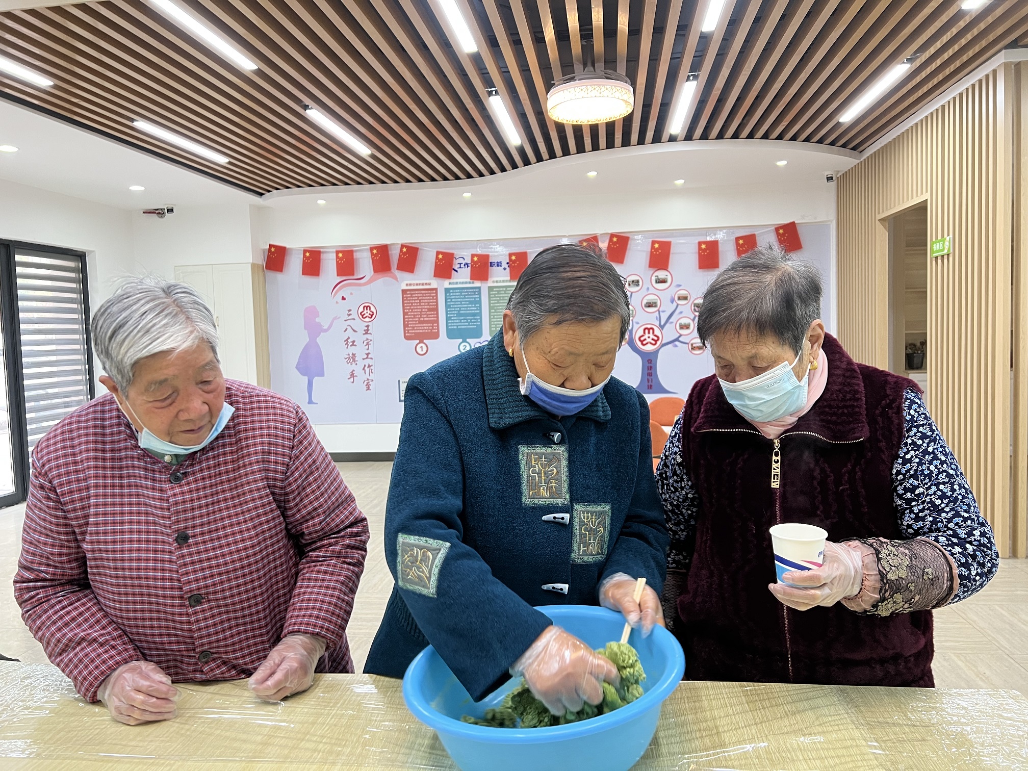 草长莺飞,暗香疏影,江南的春天很短,青团仿佛也是为春天而生,清明一过便难寻踪迹。对于南京人来说,清明节最不能缺少的就是“做清明团子”,团子、团子,团团圆圆,阖家欢乐,这样好的寓意,也让居民们对做青团这件事也充满了兴趣。只见大家模仿教学老师动作,拿起团子皮,挑选豆沙馅儿或咸菜春笋馅儿,深深地包裹进去,一个个清明团子就做好了。步骤简单,做得好看也不容易,大家做出来的团子形态各异,让人忍俊不禁。随着冒热气的团子出蒸笼,拿在手里咬一口,一股芳香和老底子味道油然而生。居民们欢呼雀跃,一起品尝,清明团子的香味满屋飘荡,大家有说有笑,温馨又热闹。