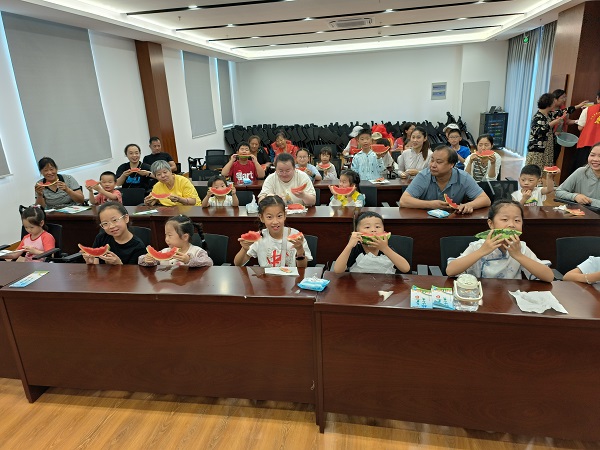 “赤日及时过,清风无处寻”,当天活动正值大暑节气,在组织完党史学习活动后,志愿者为退休党员和孩子们普及大暑节气的养生知识,叮嘱大家健康饮食,多补充水分、多吃一些有清热解暑的水果和蔬菜。科普完养生知识,社区工作人员为大家纷发西瓜,大家吃着香甜的西瓜,顿觉暑气全消。