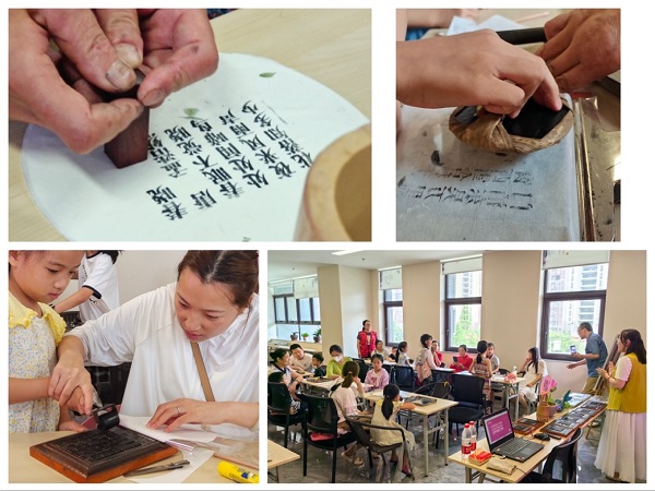 老师带领着孩子们用最传统的印刷机在手工宣纸上,切纸、滚墨、拓印、粘贴,每一道的流程都需要细心耐心,真正体现了中国人的匠人精神,让孩子们在活动中体会中国古人的智慧与勤劳。不一会儿,一首首四季诗词就跃然于团扇之上了。